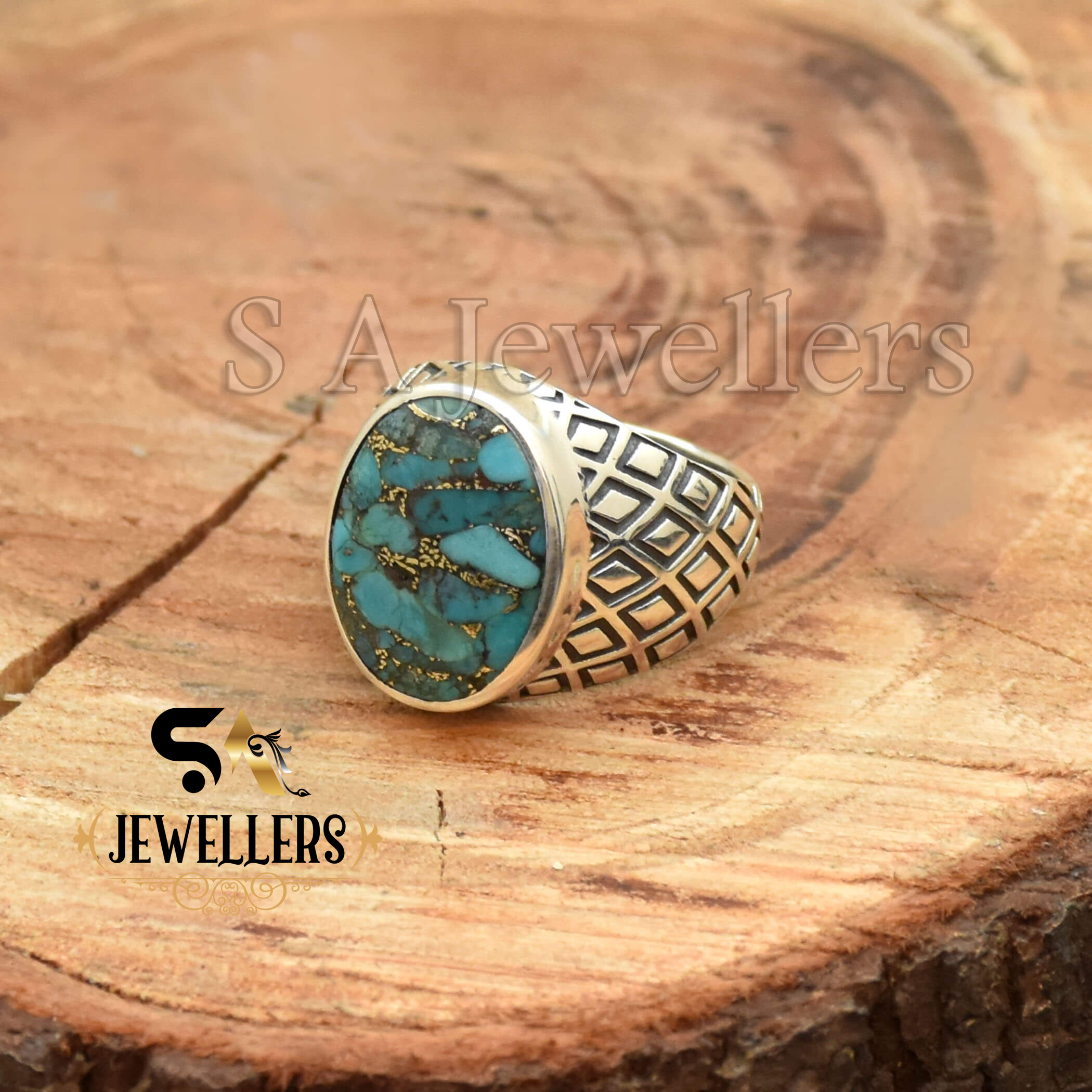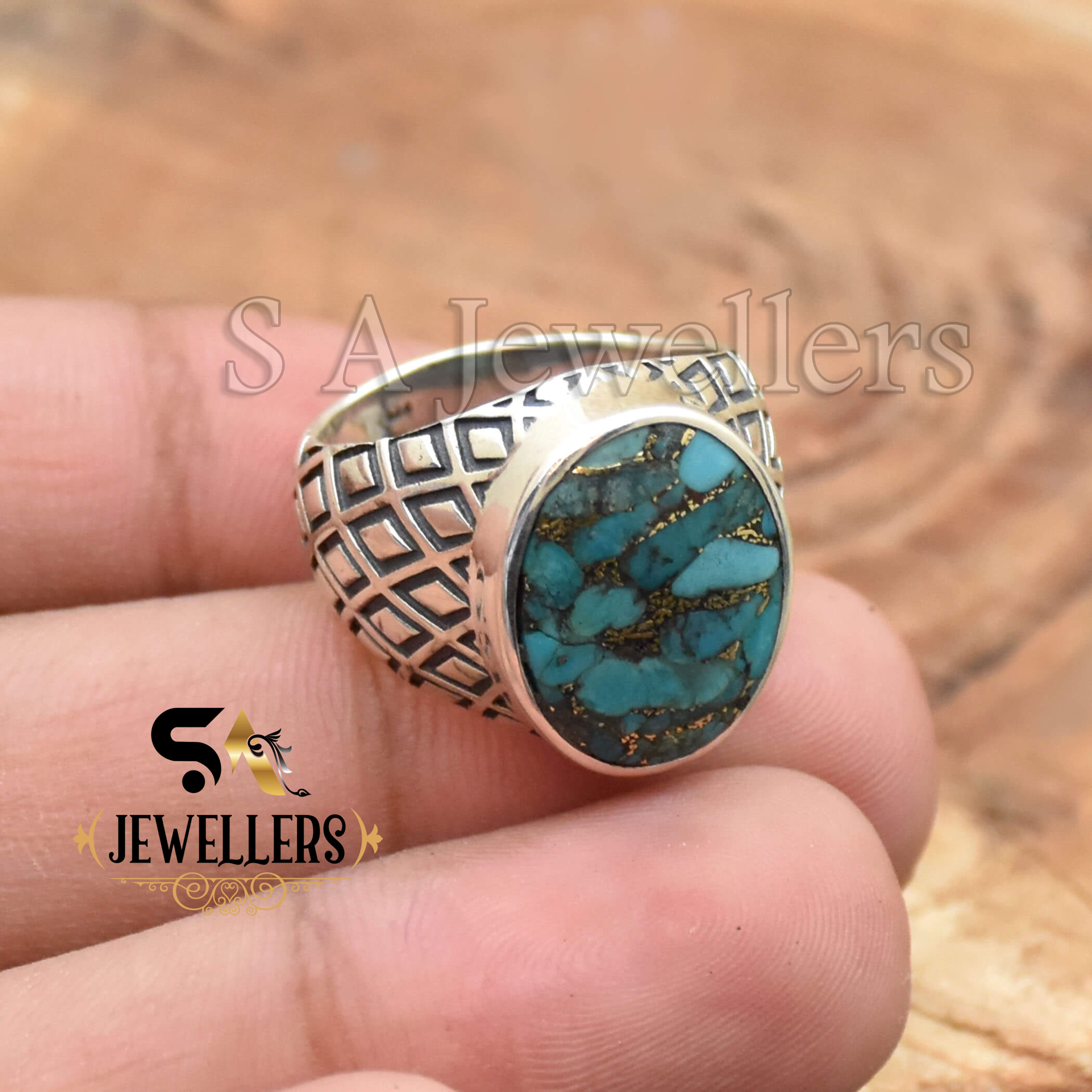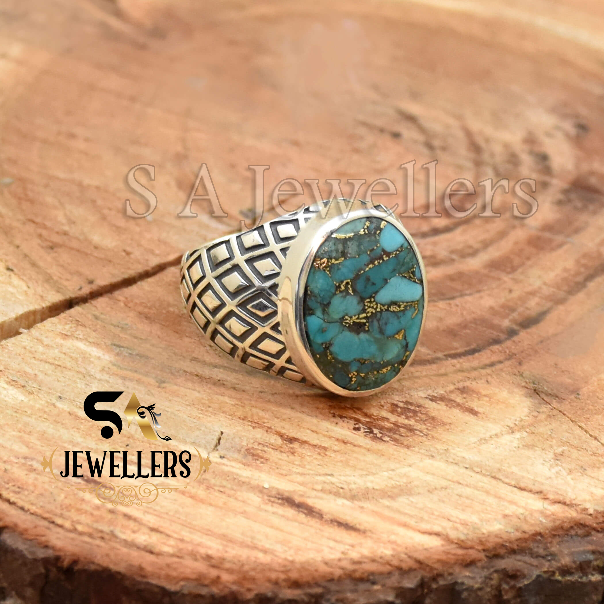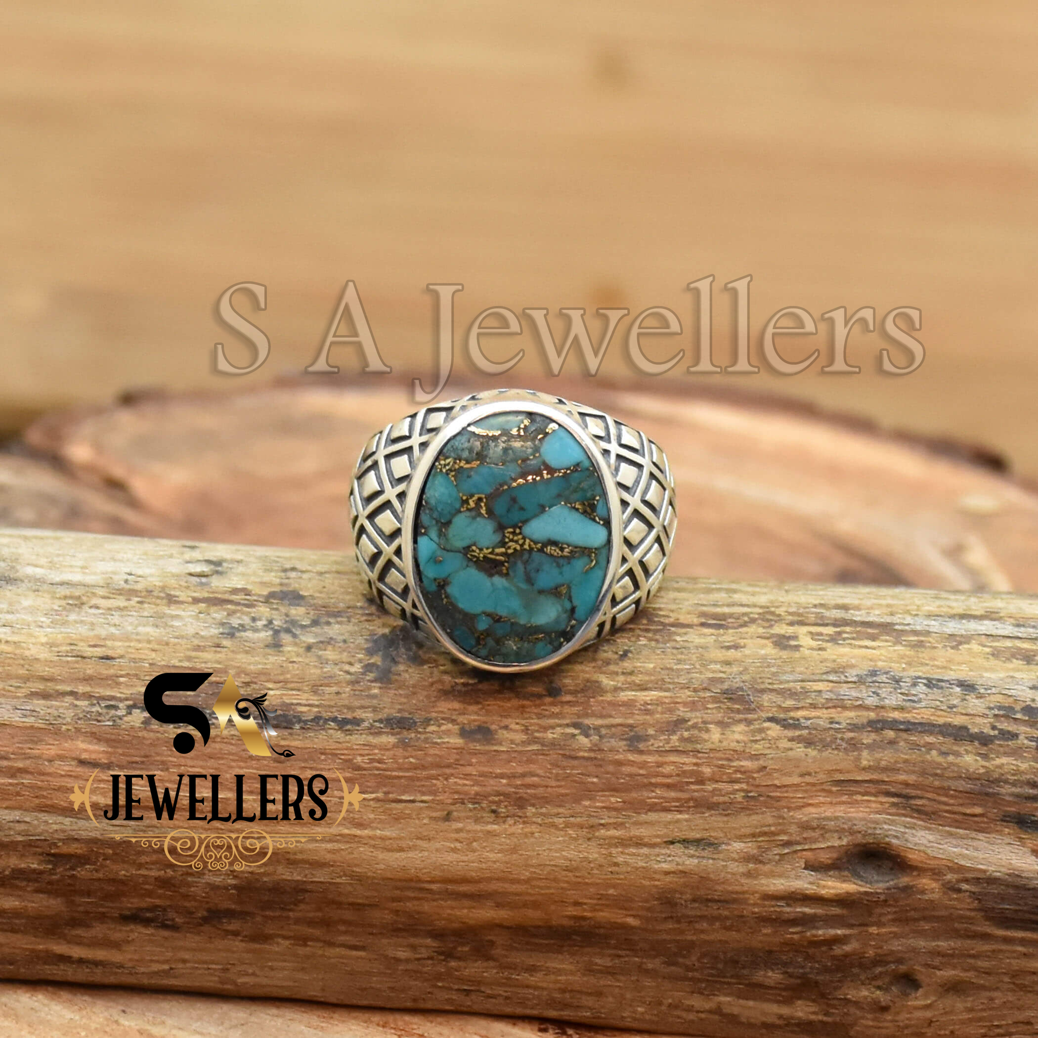 Blue Copper Turquoise Men’s Ring, 925 Sterling Silver Ring, Statement Ring, Handmade Jewelry, Textured Ring,