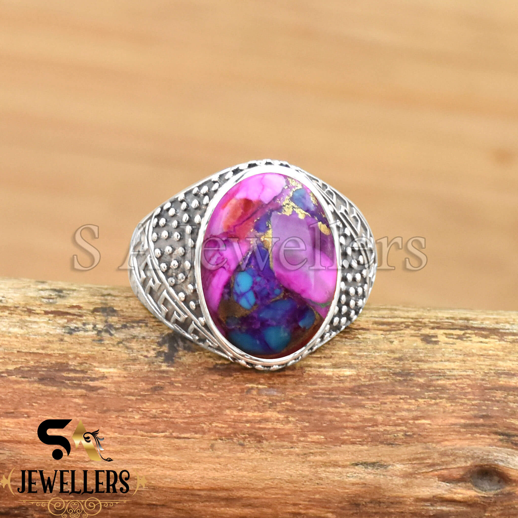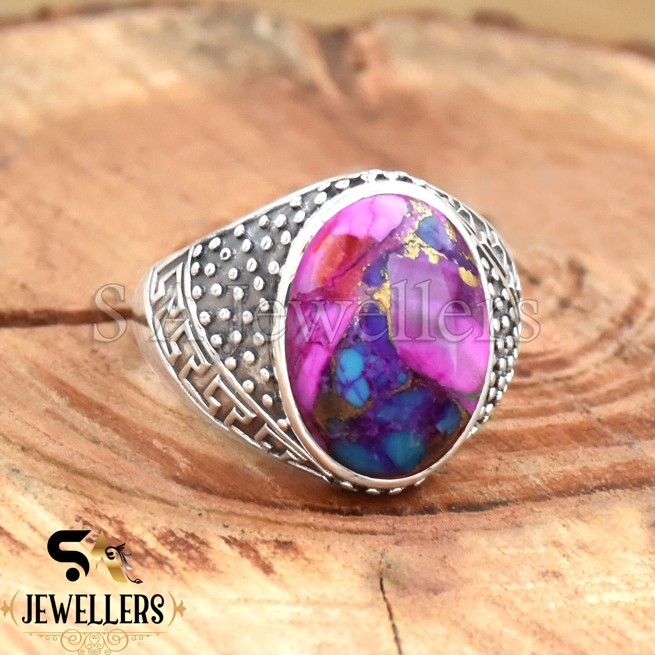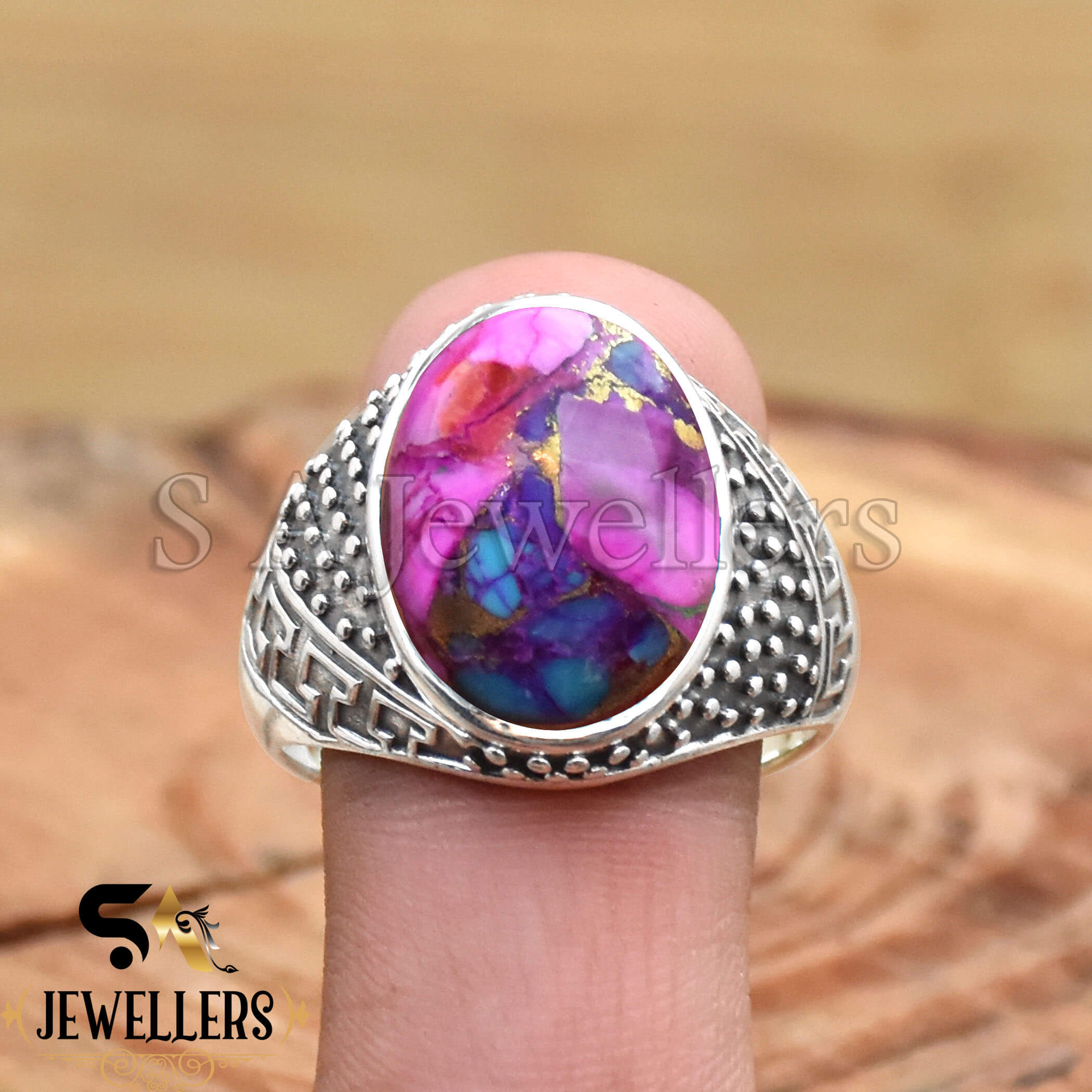 Kingman Pink Dahlia Turquois Men’s Ring, 925 Sterling Silver Ring, Boho Ring, Statement Ring, Stylish Silver Ring,