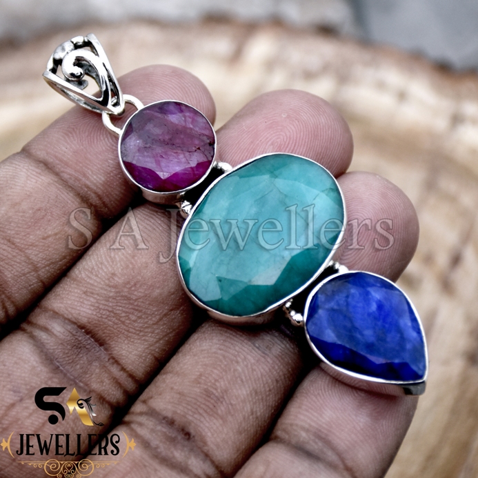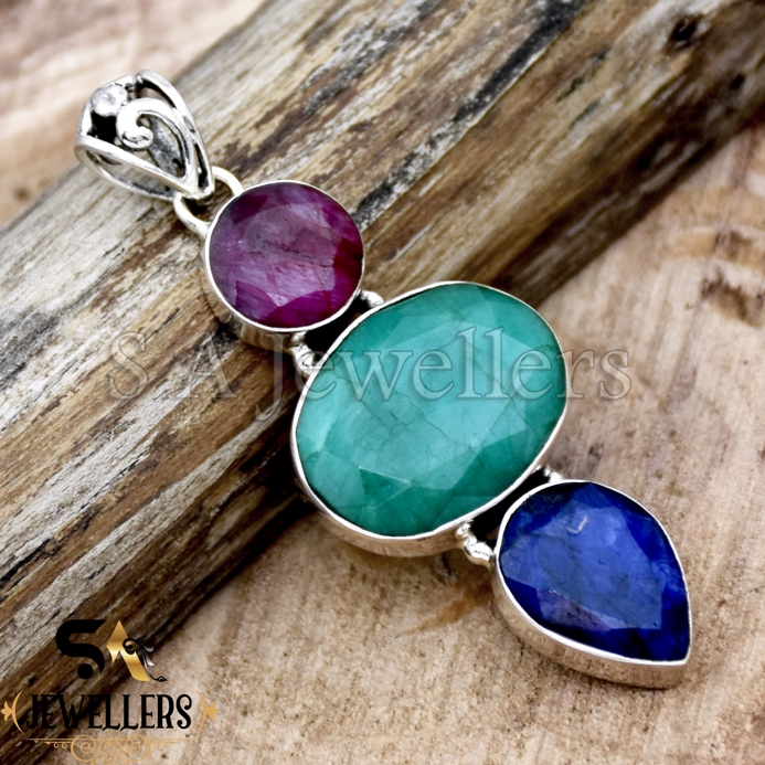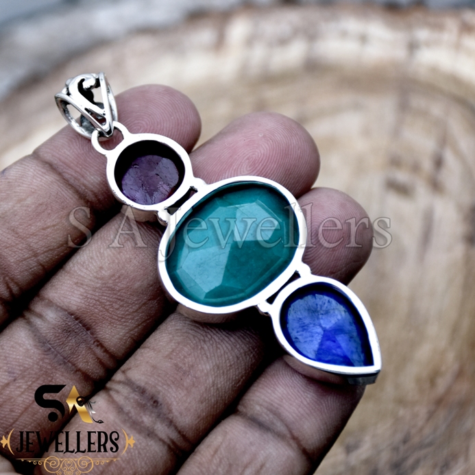 Indian Emerald Silver Pendant, Multi Gemstone Pendant, 925 Sterling Silver Pendant,