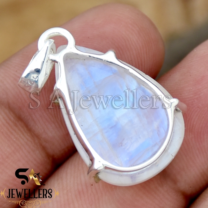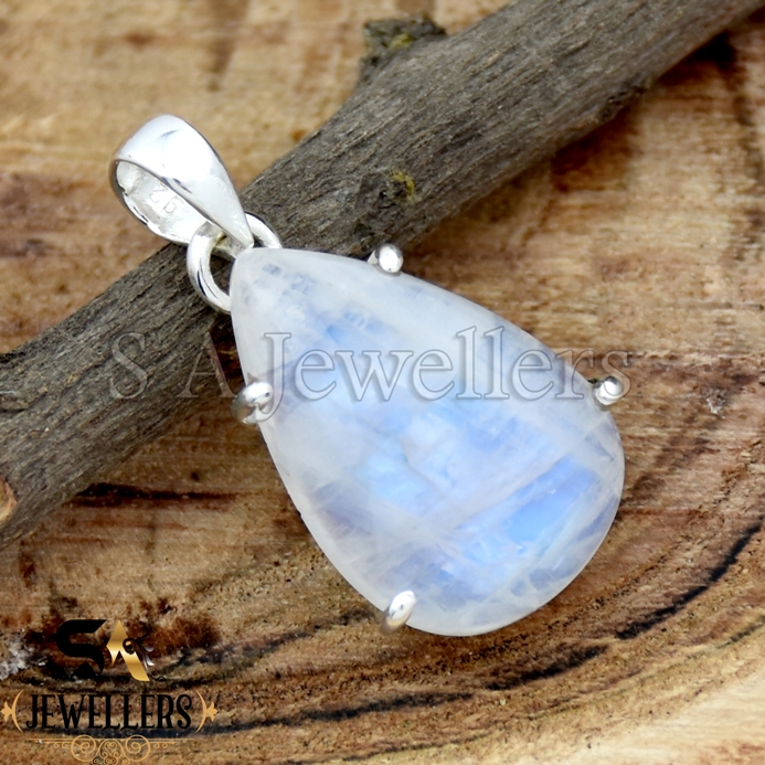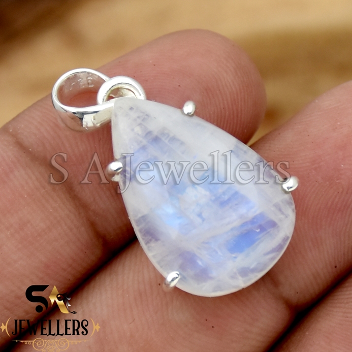 Natural Rainbow Moonstone Prong Pendant, 925 Sterling Silver Pendant
