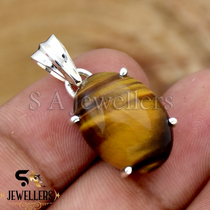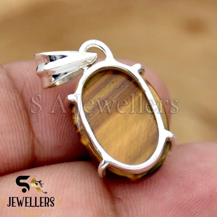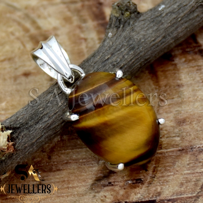 Natural Tiger Eye Pendant, 925 Sterling Silver Prong Pendant