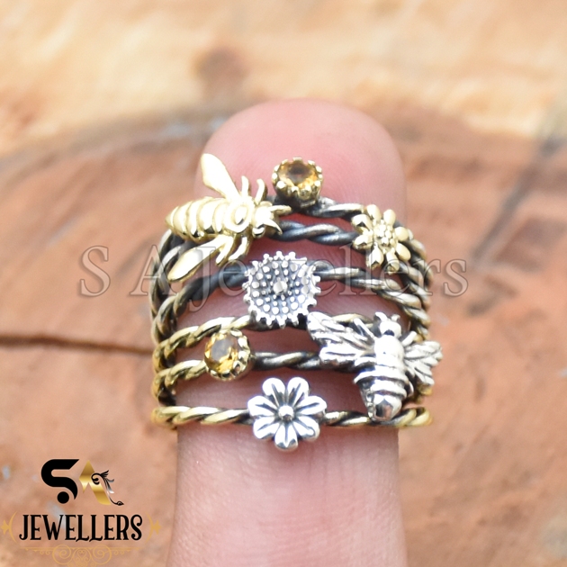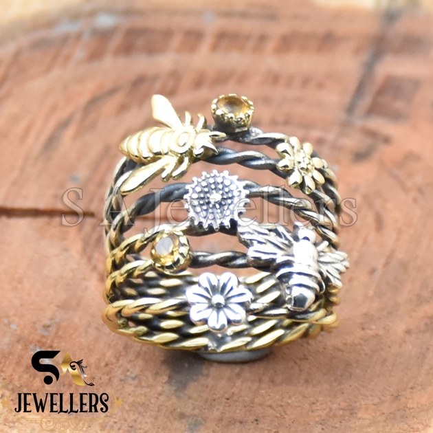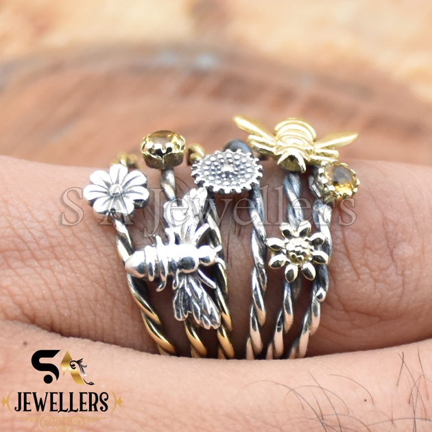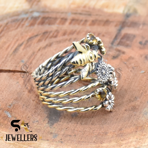 Garden Stacker Ring, Flower Bee Ring, 925 Sterling Silver Ring, Two Tone Ring