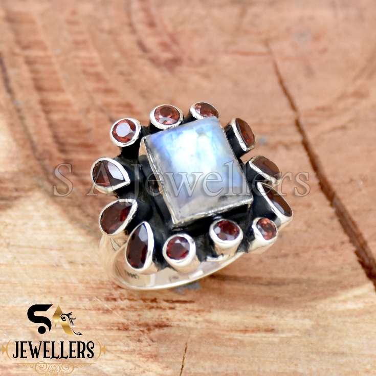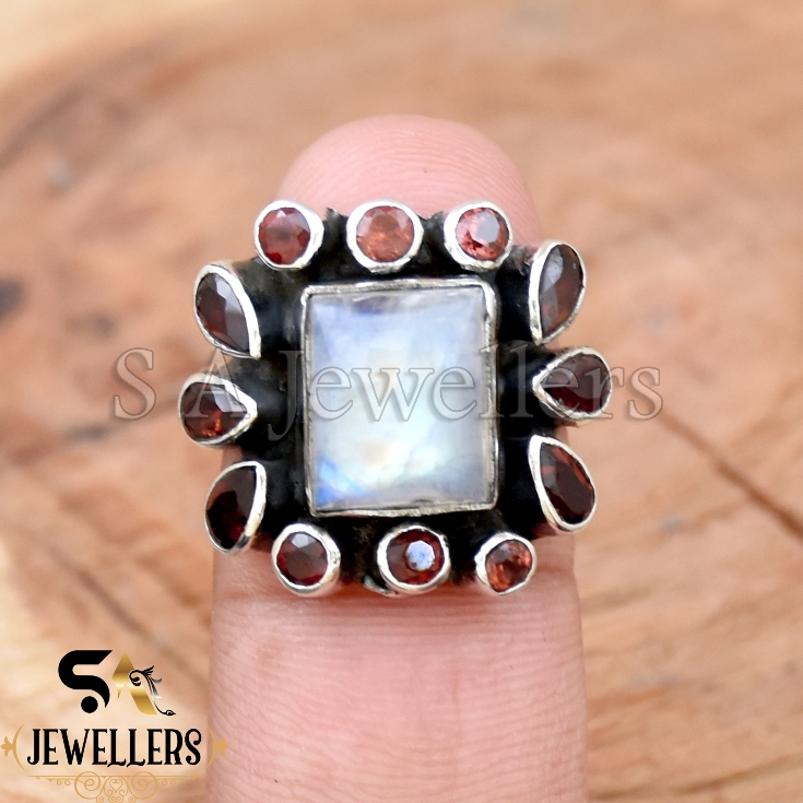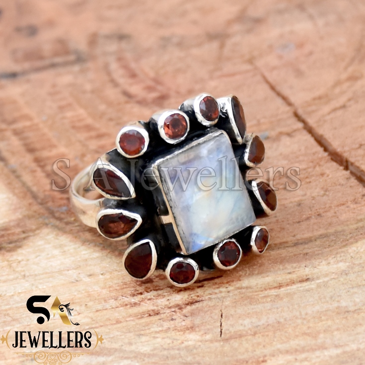 Moonstone and Garnet Ring, 925 Sterling Silver Ring, Handmade Ring,