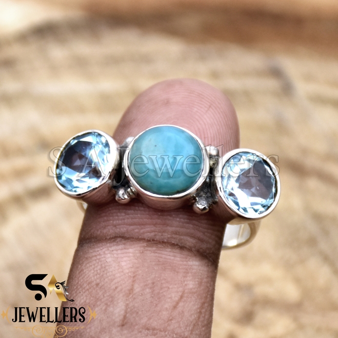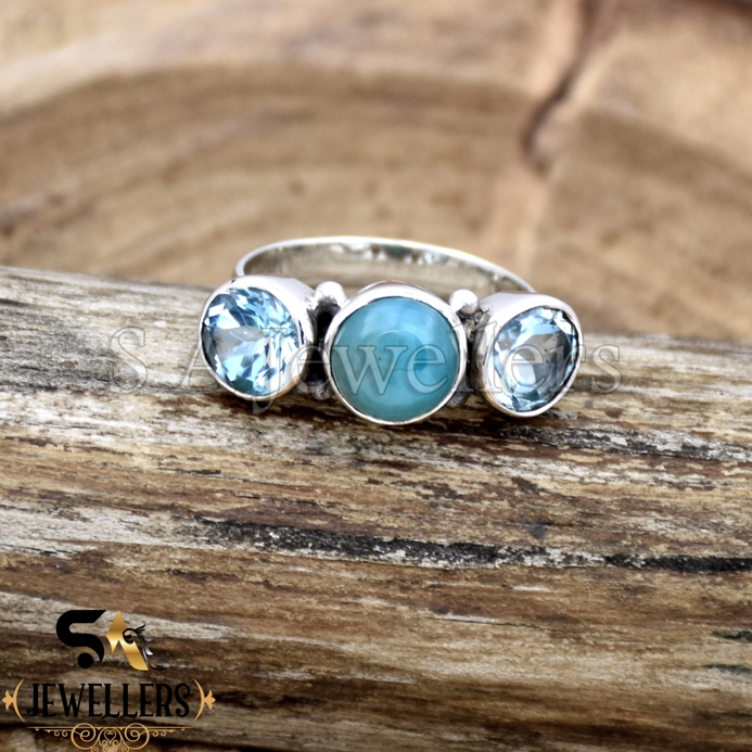 925 Sterling Silver Ring, Larimar And Blue Topaz Ring, Gemstone Ring