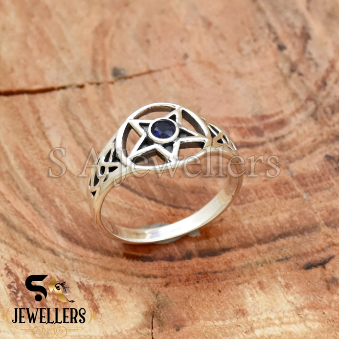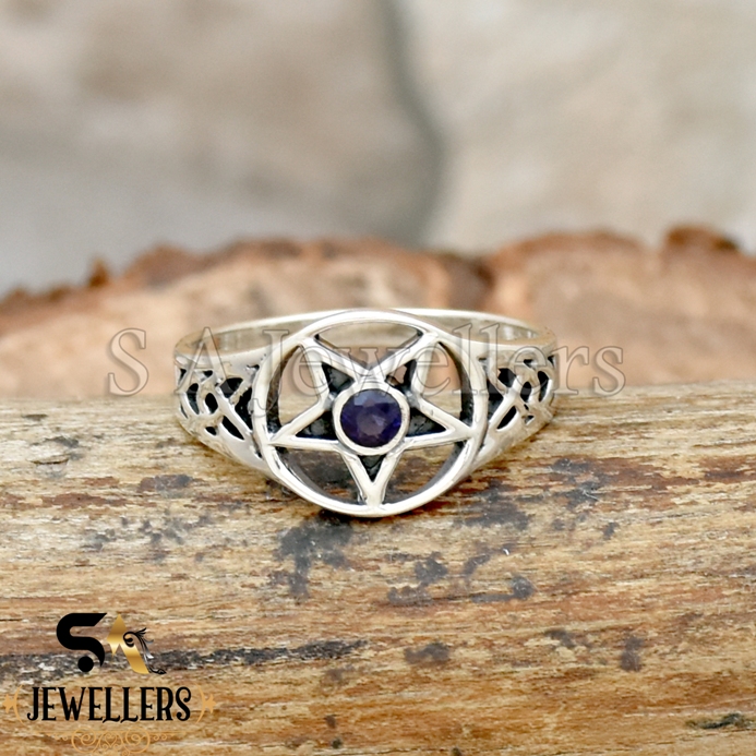 925 Sterling Silver Pentacle Pentagram Ring Iolite Celtic Trinity Ring