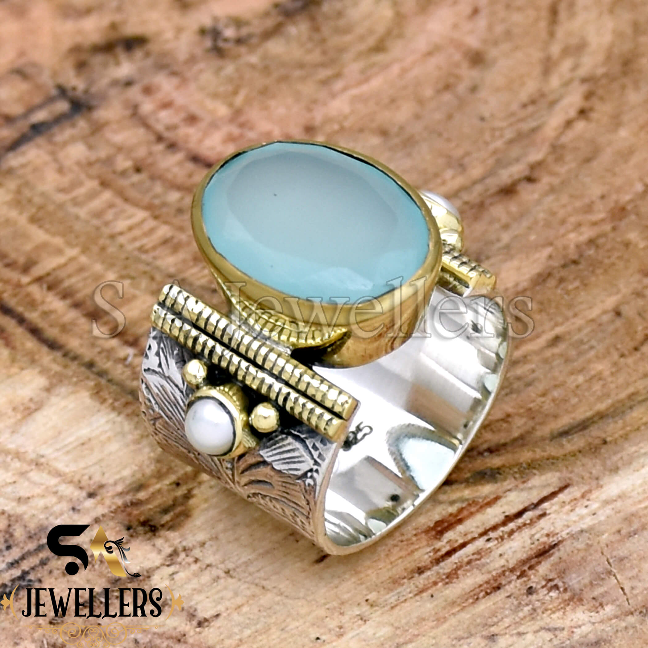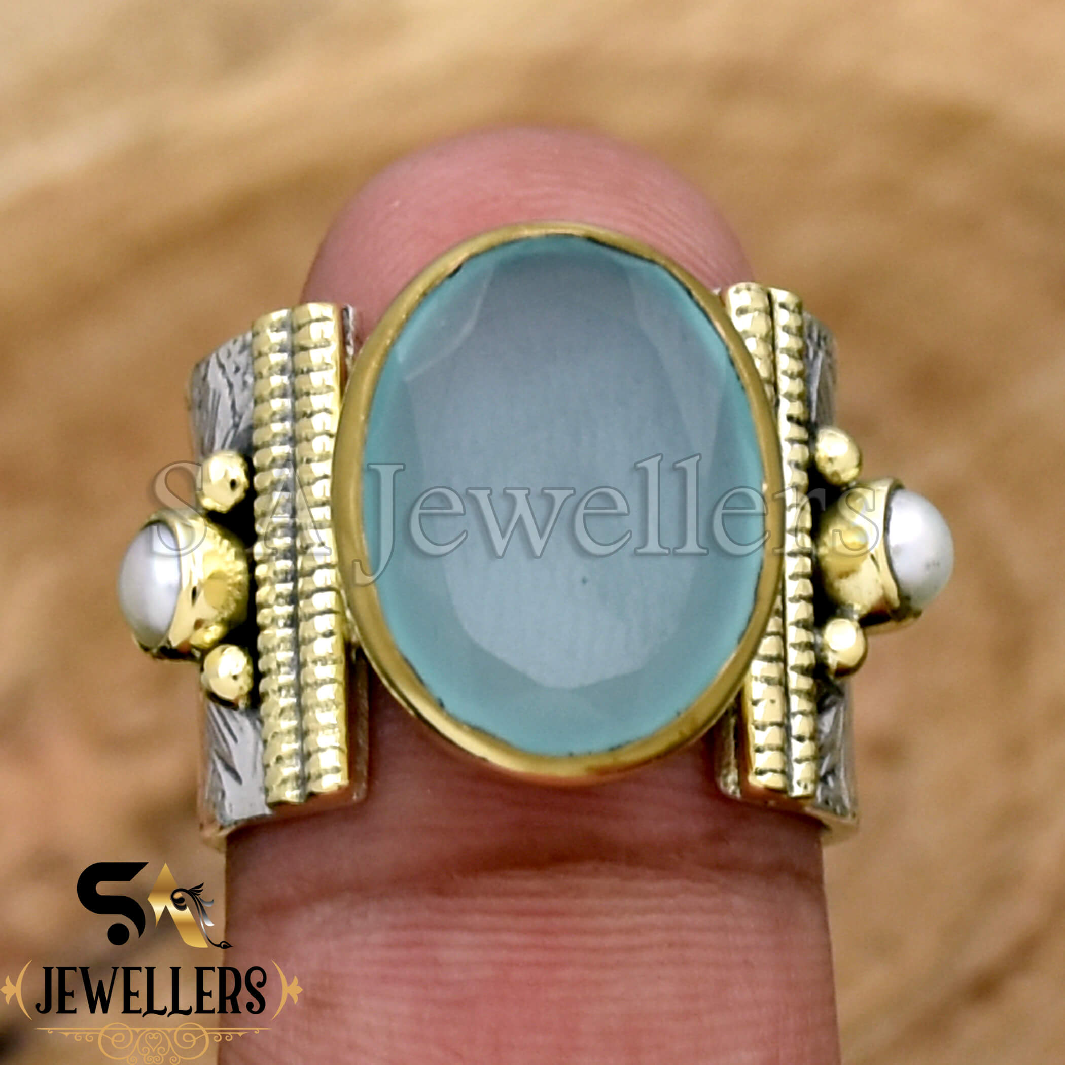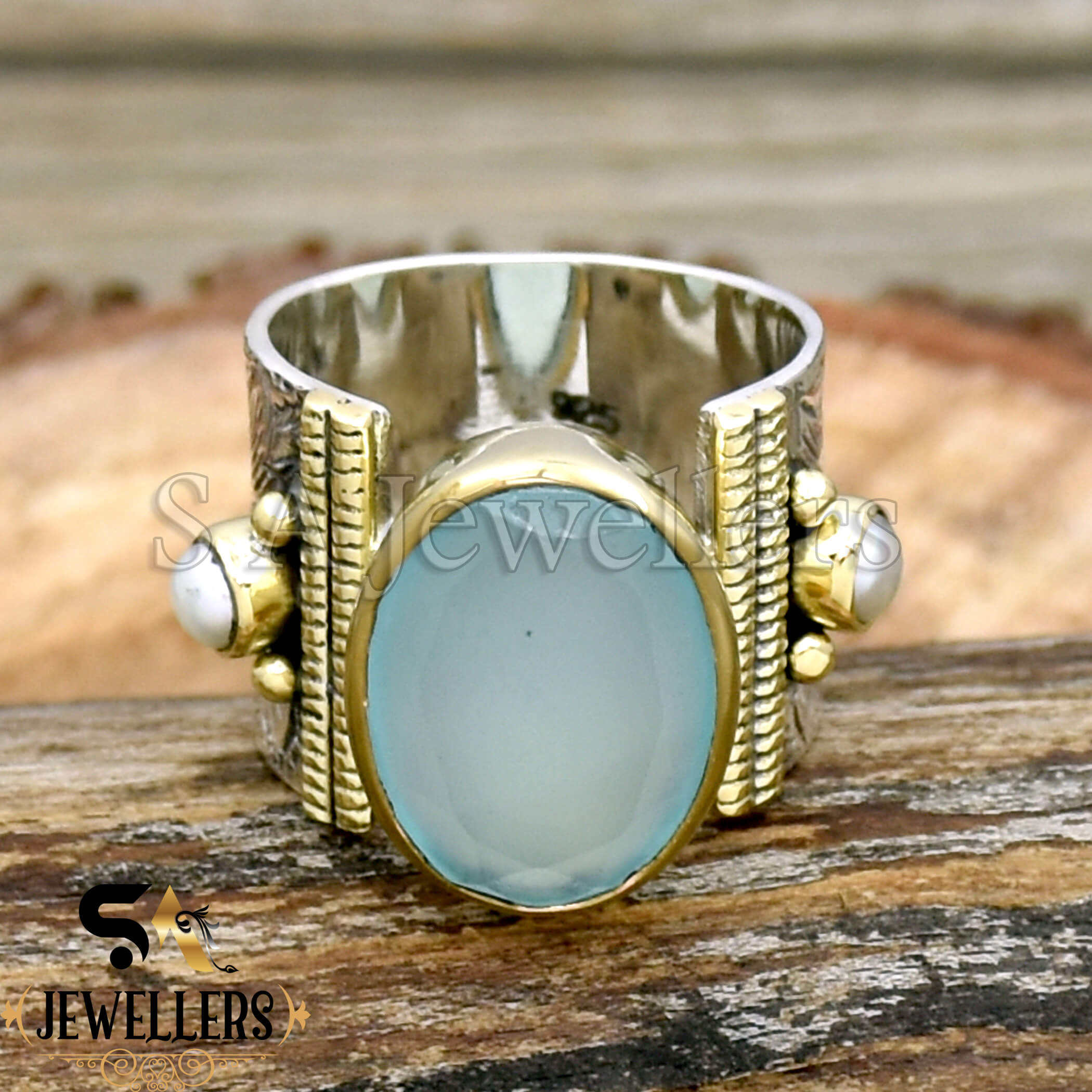 Blue Chalcedony Ring, 925 Sterling Silver Ring, Blue Chalcedony & Pearl Ring Two Tone Ring, Wide Ring, Flower Textured Ring