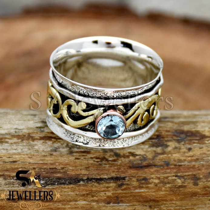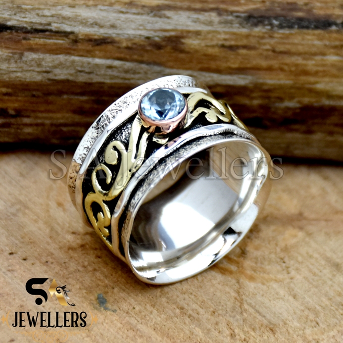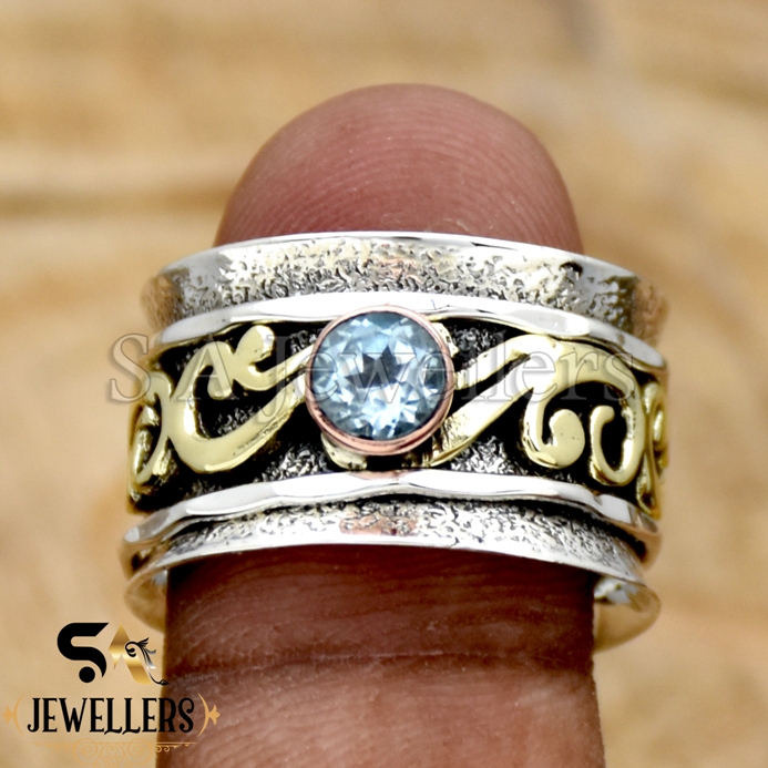 Blue Topaz Spinner Ring, 925 Sterling Silver Ring, Three Tone Ring, Wide Band