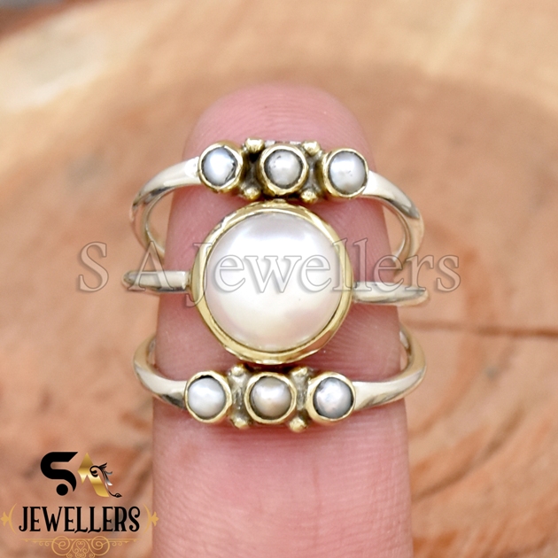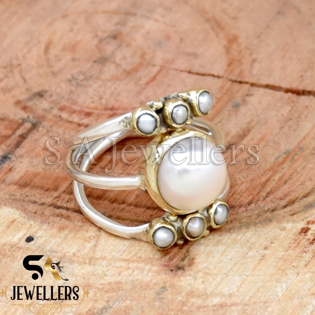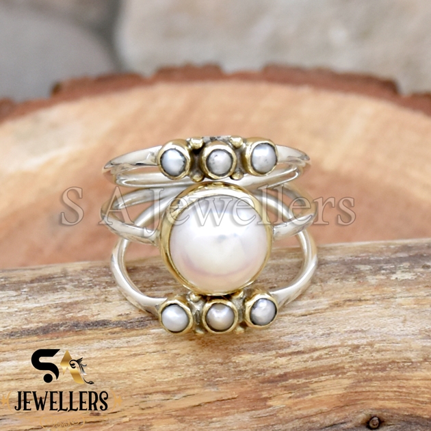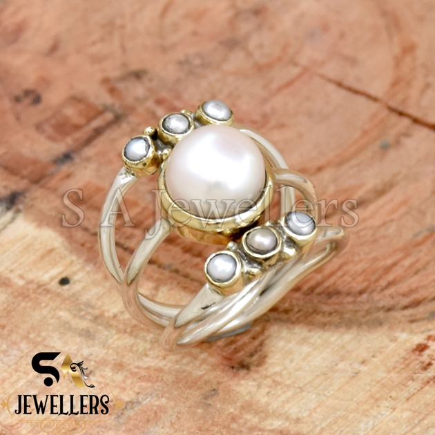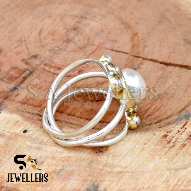Fresh Water Pearl Ring, Band Ring, 925 Sterling Silver Ring, Two Tone Ring