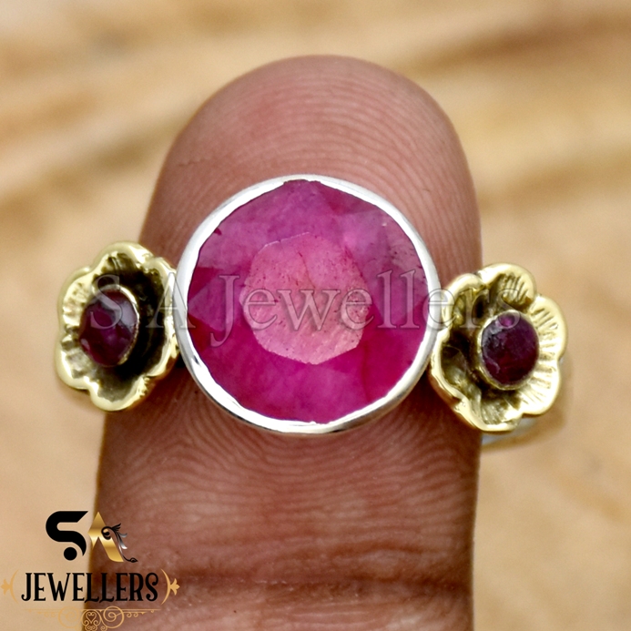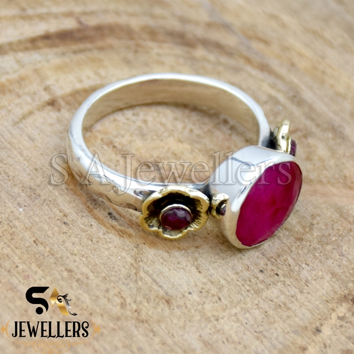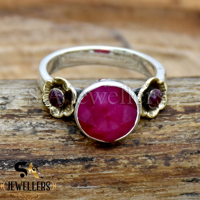 India Ruby Ring, Flower Ring, 925 Sterling Silver, Boho Ring, Two Tone Ring