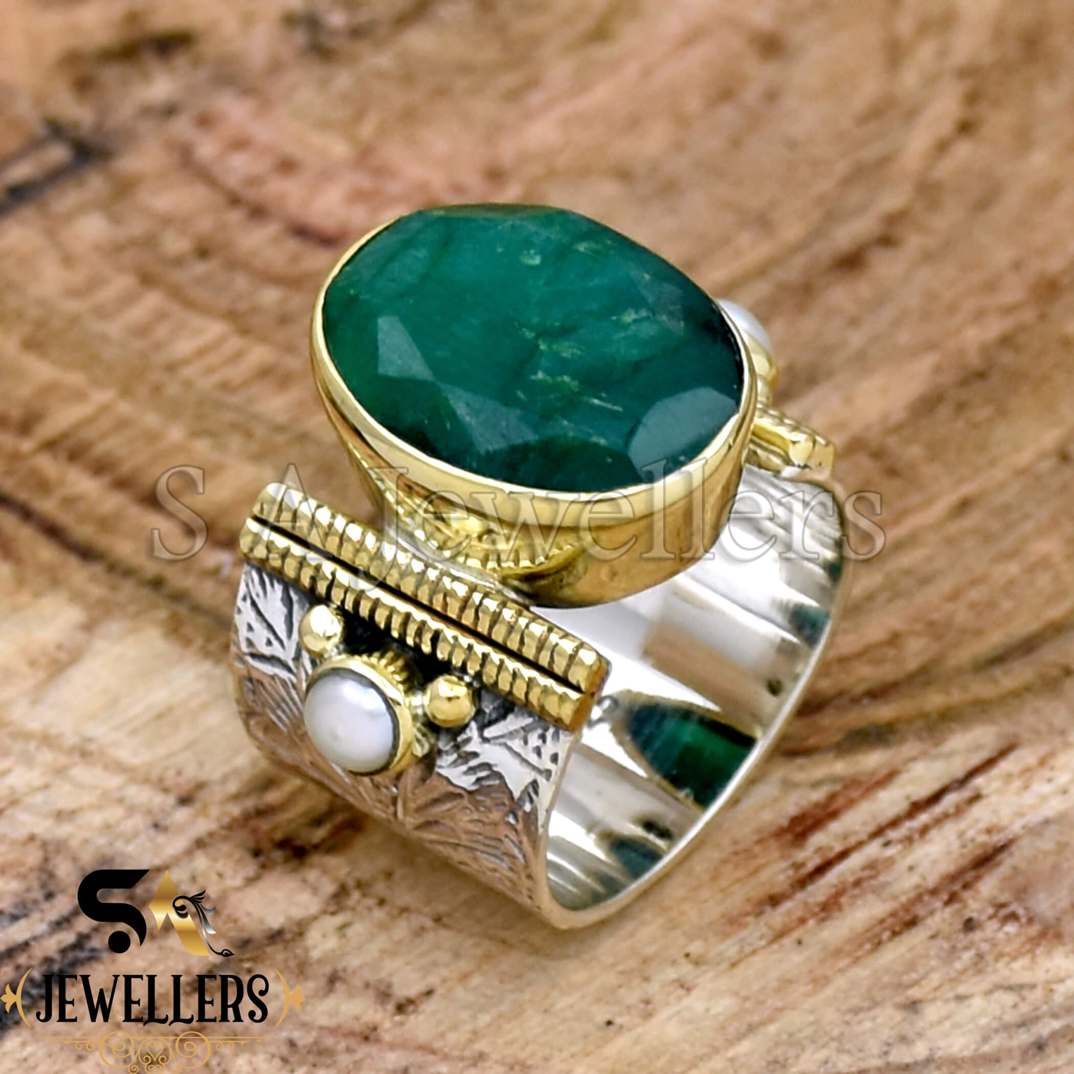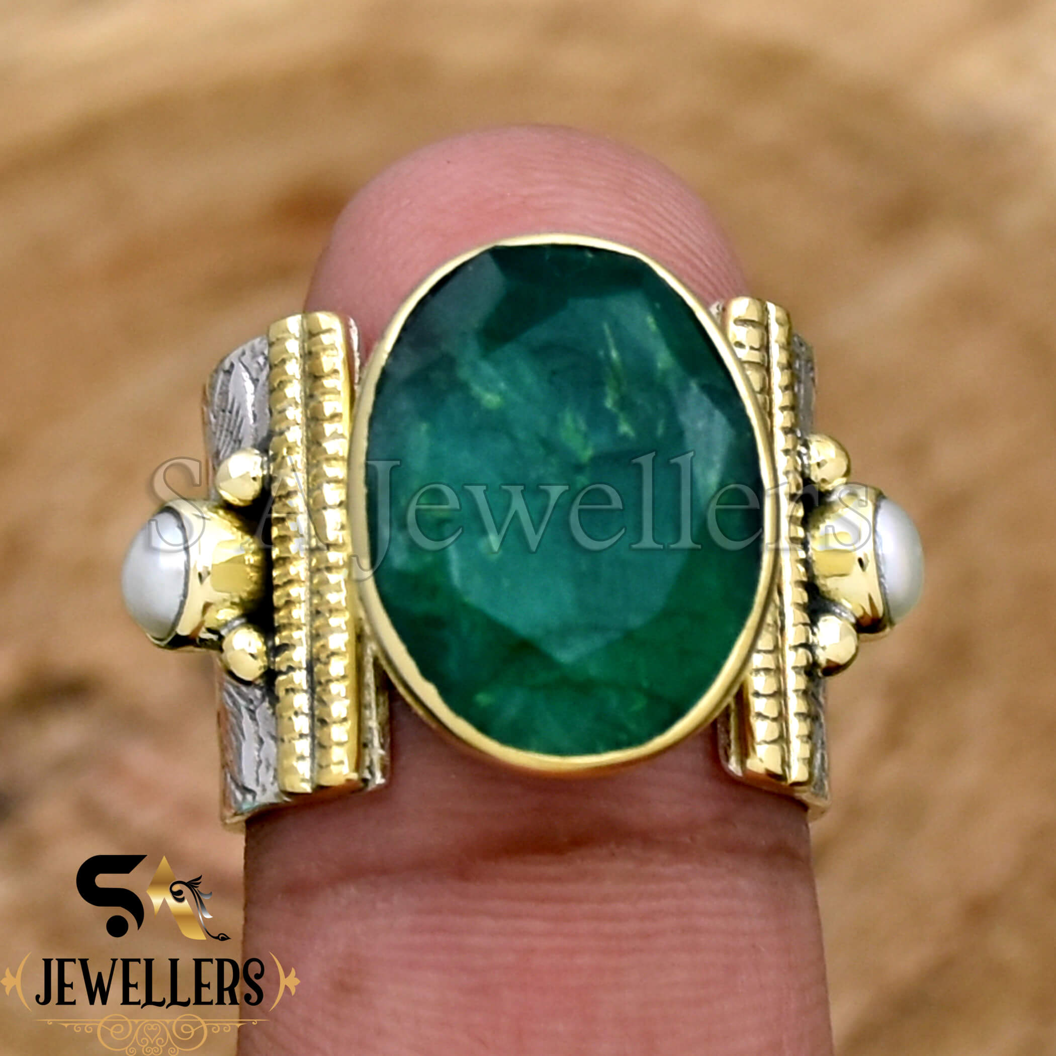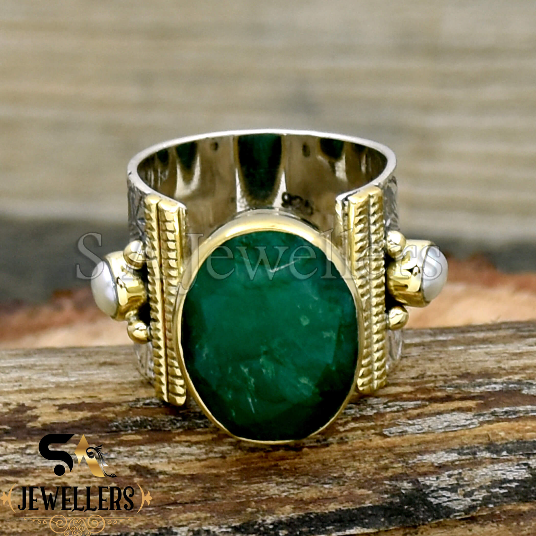 Indian Emerald Ring, 925 Sterling Silver Ring, Emerald & Pearl Ring Two Tone Ring, Wide Ring, Flower Textured Ring