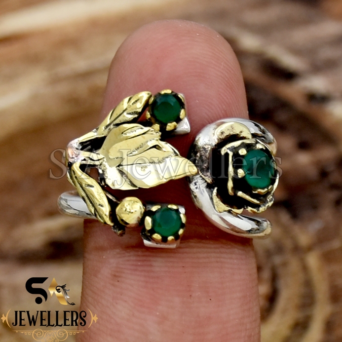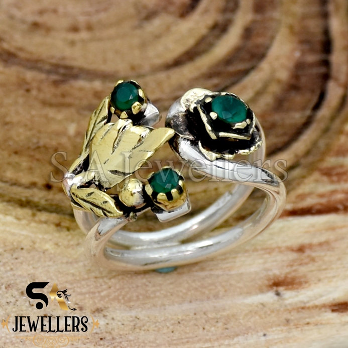 Indian Emerald Silver Ring, 925 Sterling Silver Ring, Two Tone Leaf Ring