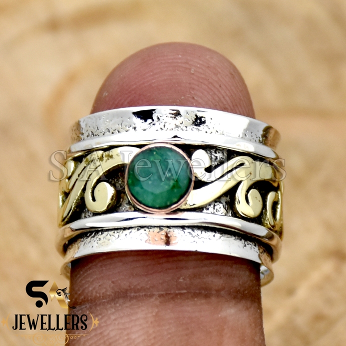 Indian Emerald Silver Ring, Handmade 925 Sterling Silver Ring, Wide Band Two Tone Ring
