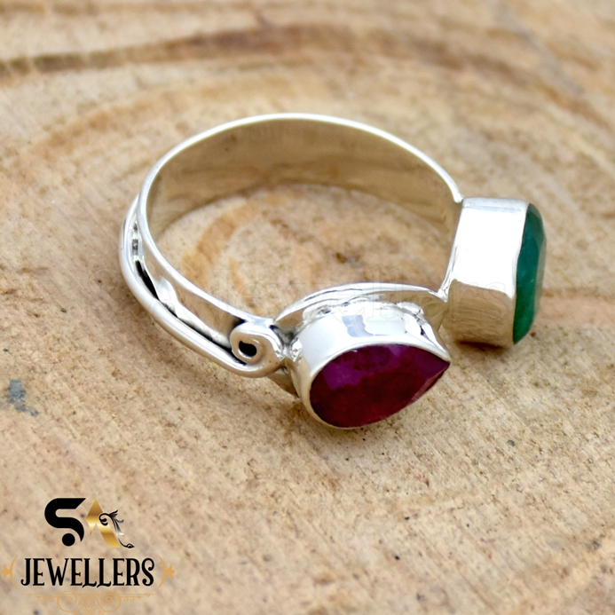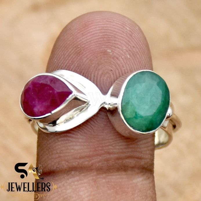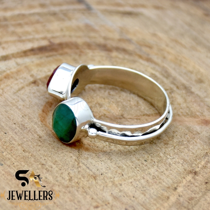 Indian Ruby & Emerald Ring, 925 Sterling Silver Ring, Double Stone Silver Ring