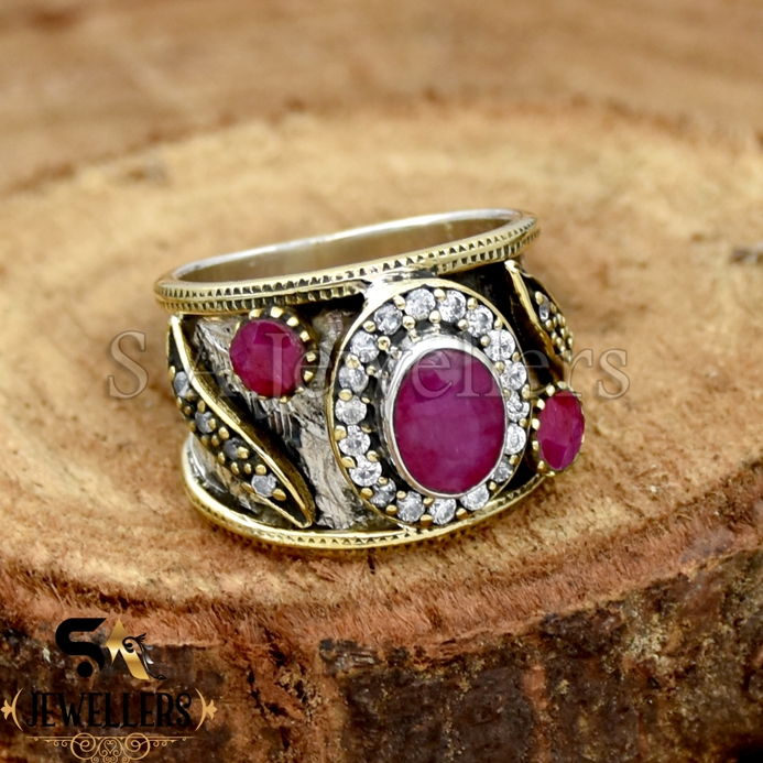 Indian Ruby Ring, Amazing Ruby & CZ Ring, 925 Sterling Silver Two Tone Ring, Textured Band Ring