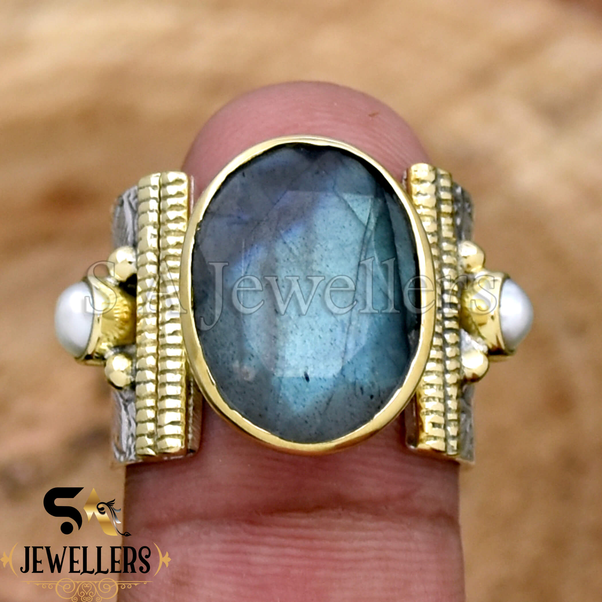 Labradorite Ring, 925 Sterling Silver Ring, Labradorite & Pearl Ring, Two Tone Ring, Wide Ring, Flower Textured Ring, Anniversary Gift