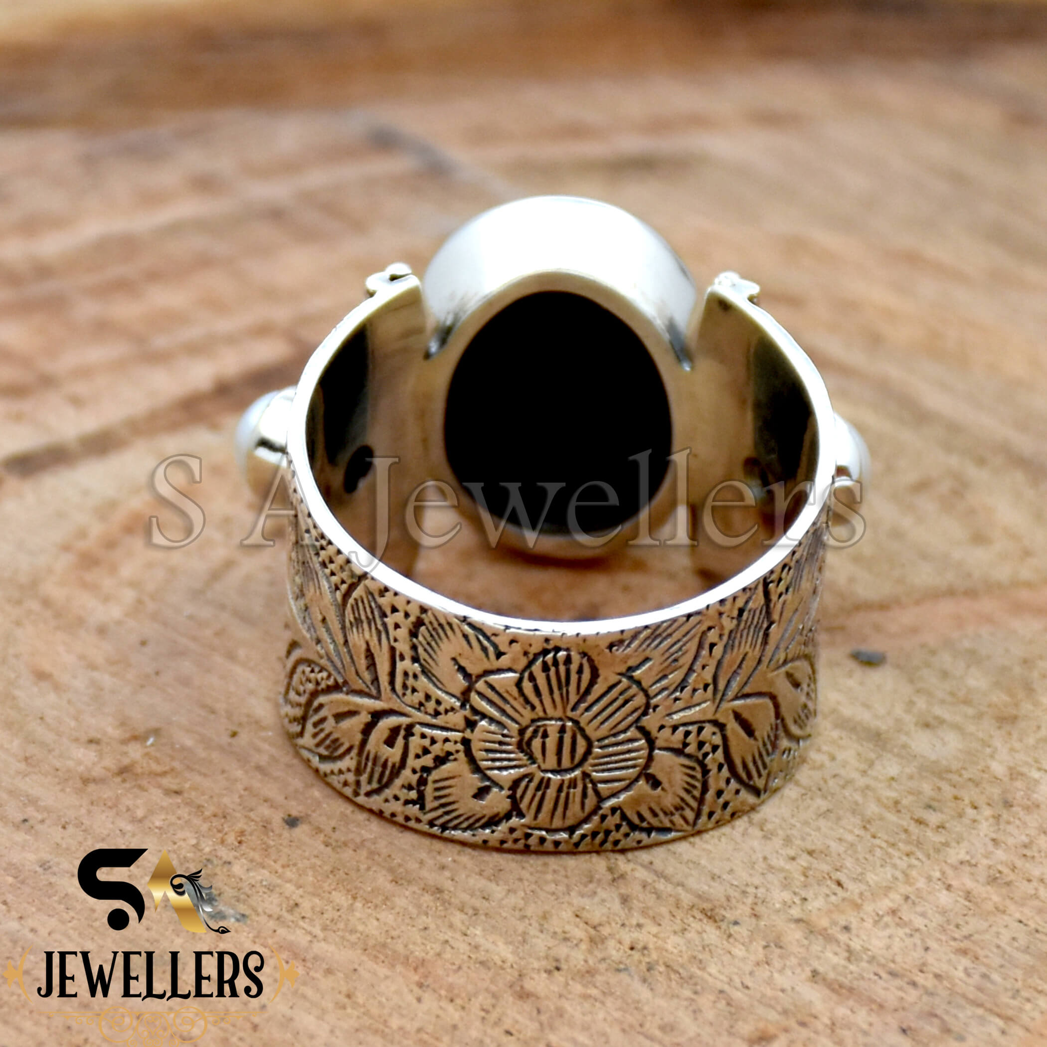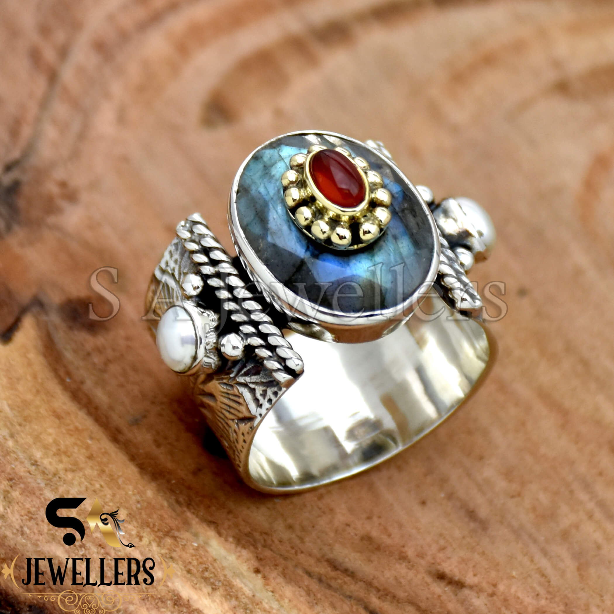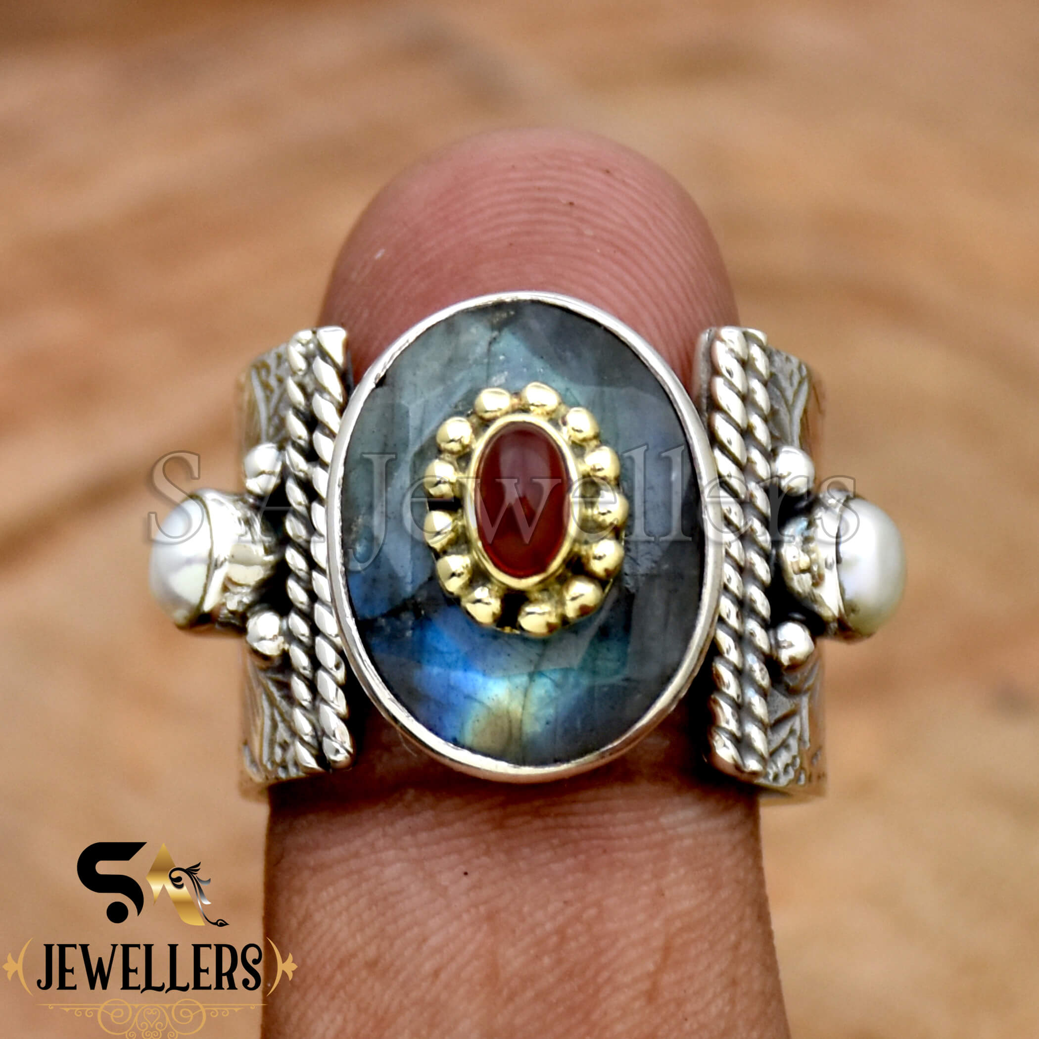 Labradorite Ring, 925 Sterling Silver Ring, Garnet & Pearl Ring, Two Tone Ring, Wide Band Ring, Flower Textured Ring,  Anniversary Gift