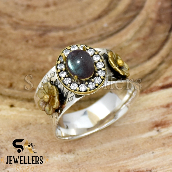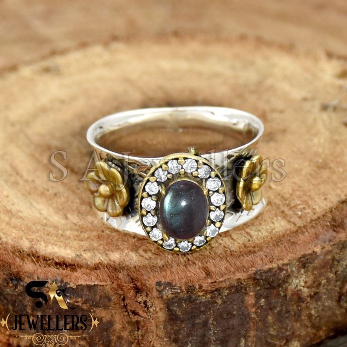 Labradorite Ring, Flower CZ Ring, 925 Sterling Silver Two Tone Ring, Textured Band