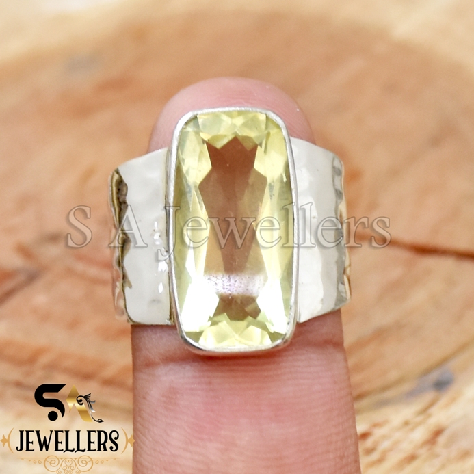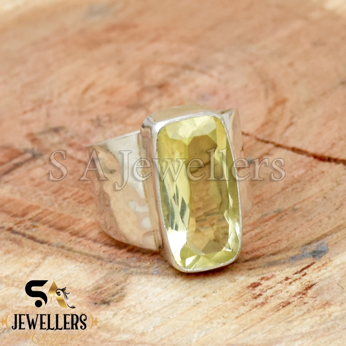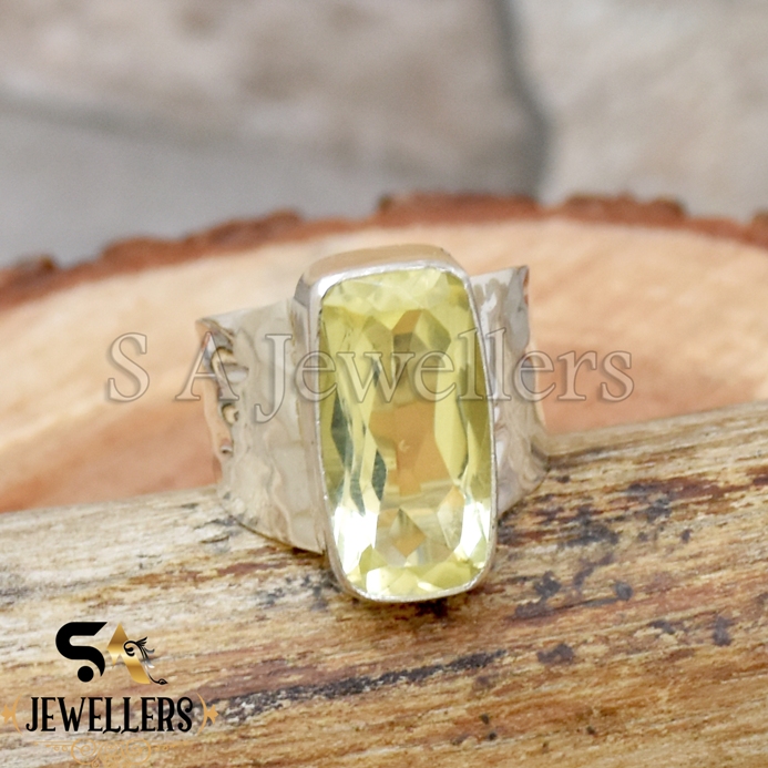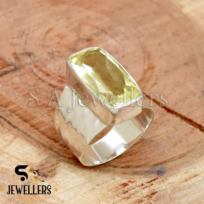 Lemon Topaz Ring, 925 Sterling Silver Ring, Hammered Wide Band Ring