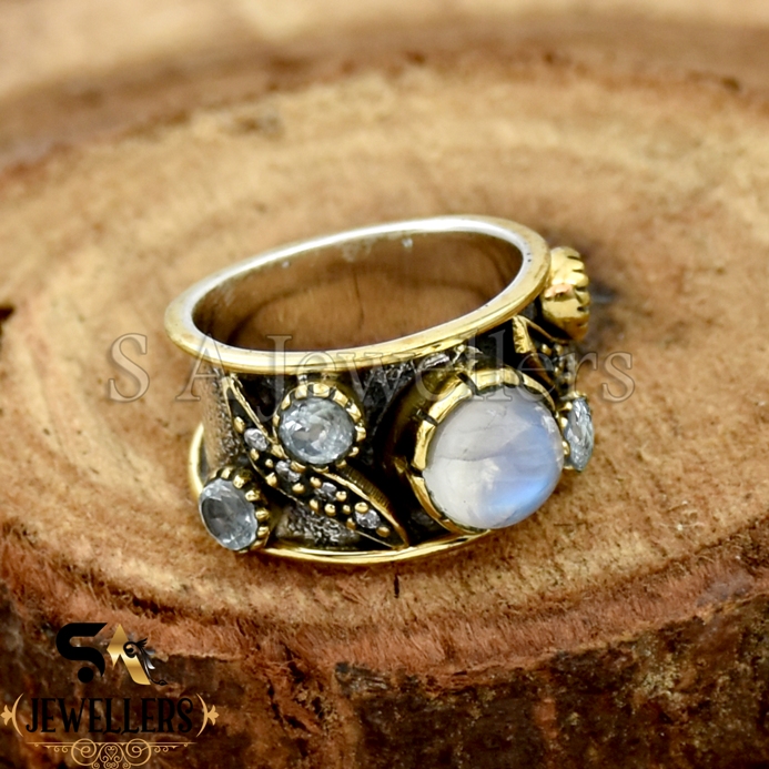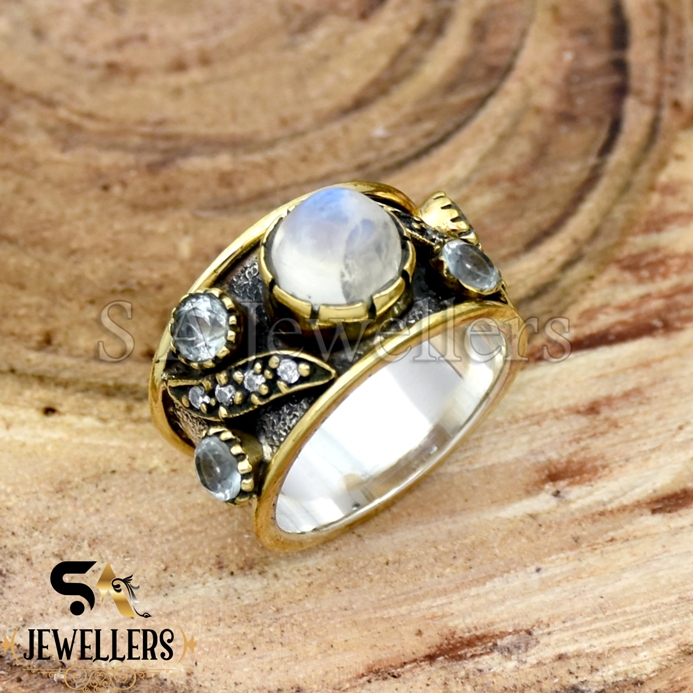 Be the first to review “Moonstone Ring, Amazing Blue Topaz & CZ Ring, 925 Sterling Silver Two Tone Ring, Wide Band Ring, Textured Band Ring,”
