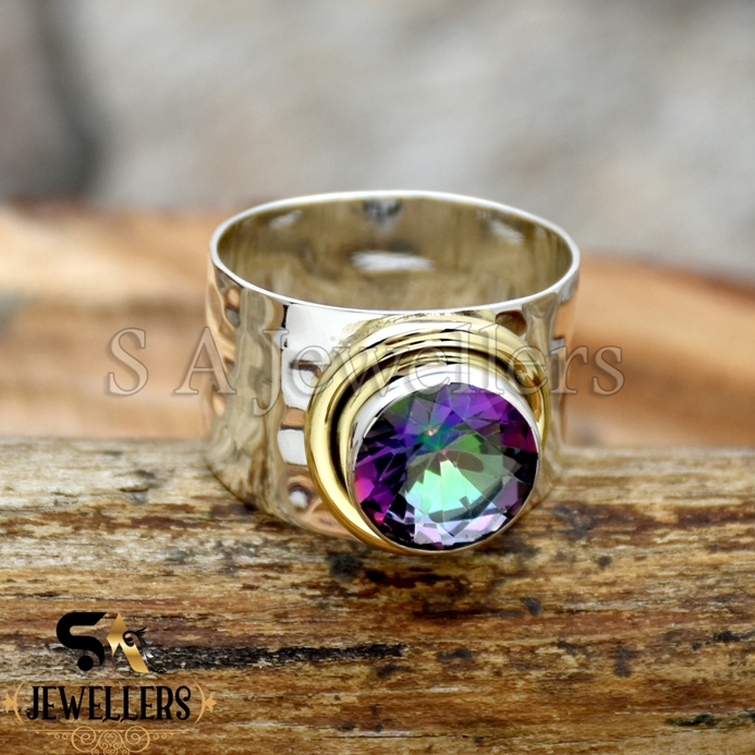 Mystic Topaz Ring, 925 Sterling Silver, Wide Hammered Band, Two Tone Ring
