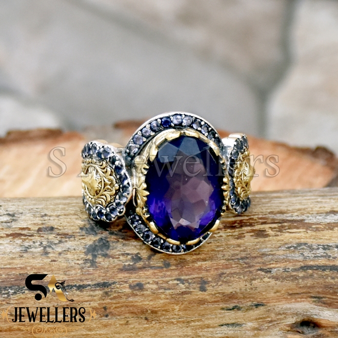 Natural Amethyst & Iolite Ring, 925 Sterling Silver, Women’s Ring, Two Tone Ring