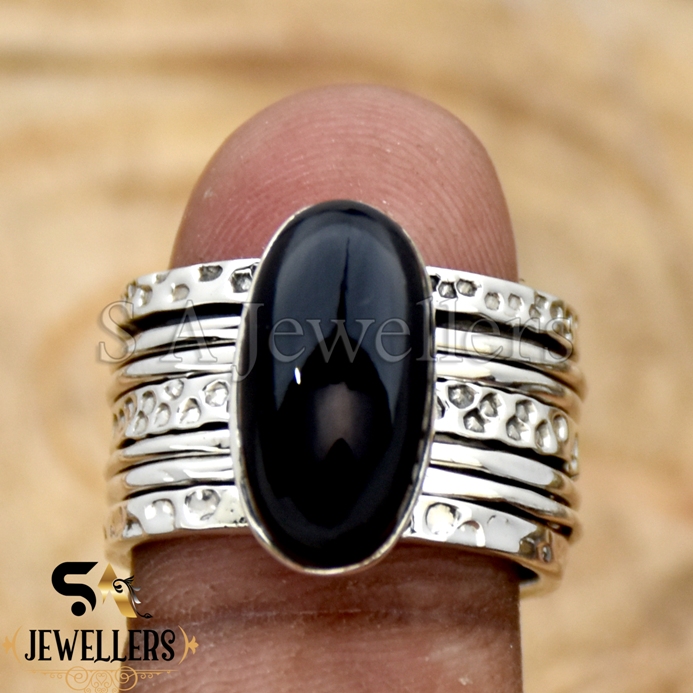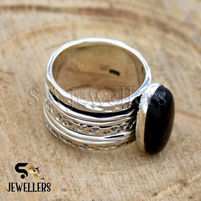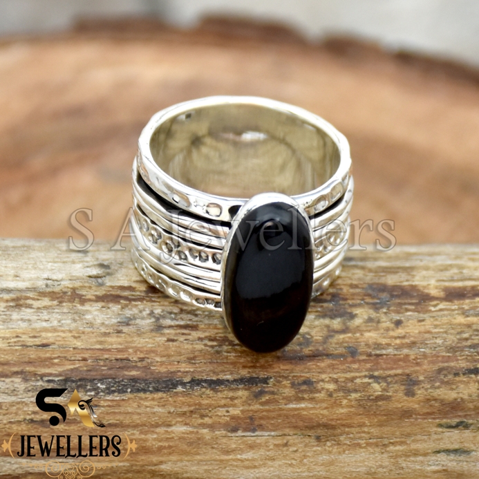 Natural Black Onyx Spinner Ring, 925 Sterling Silver Ring, Wide Band Ring
