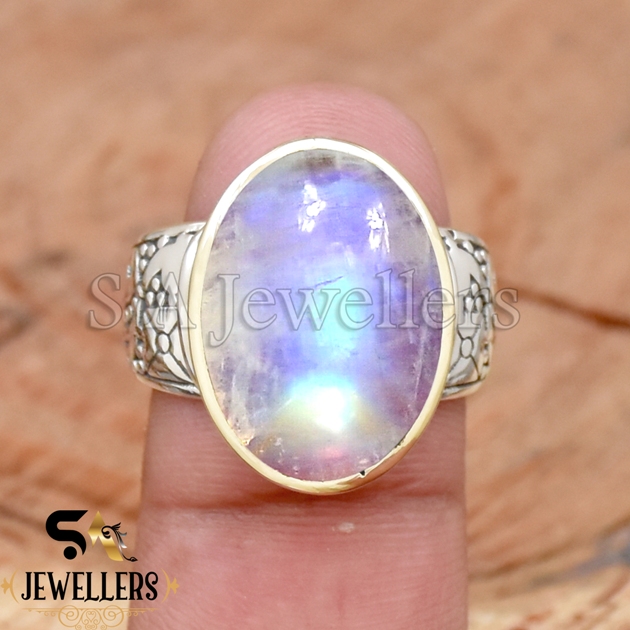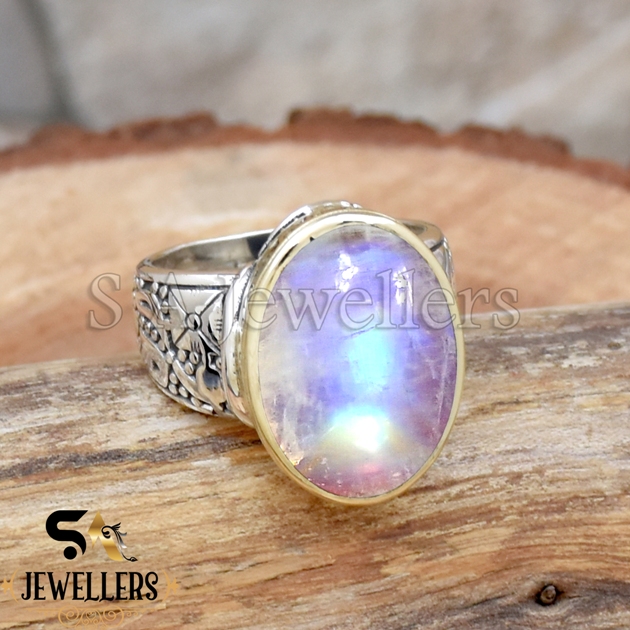 Natural Rainbow Moonstone Ring, 925 Sterling Silver Ring, Tow Tone Ring