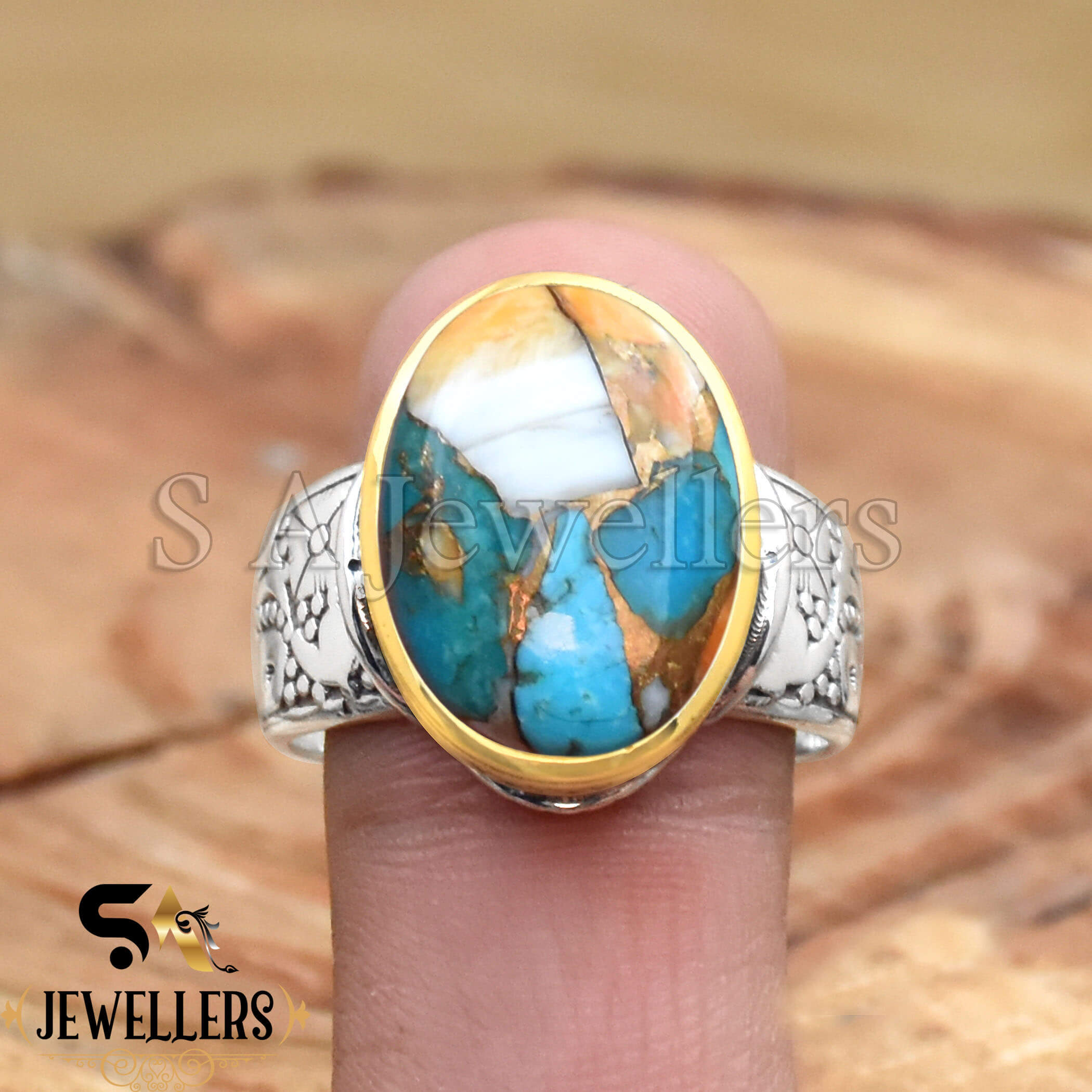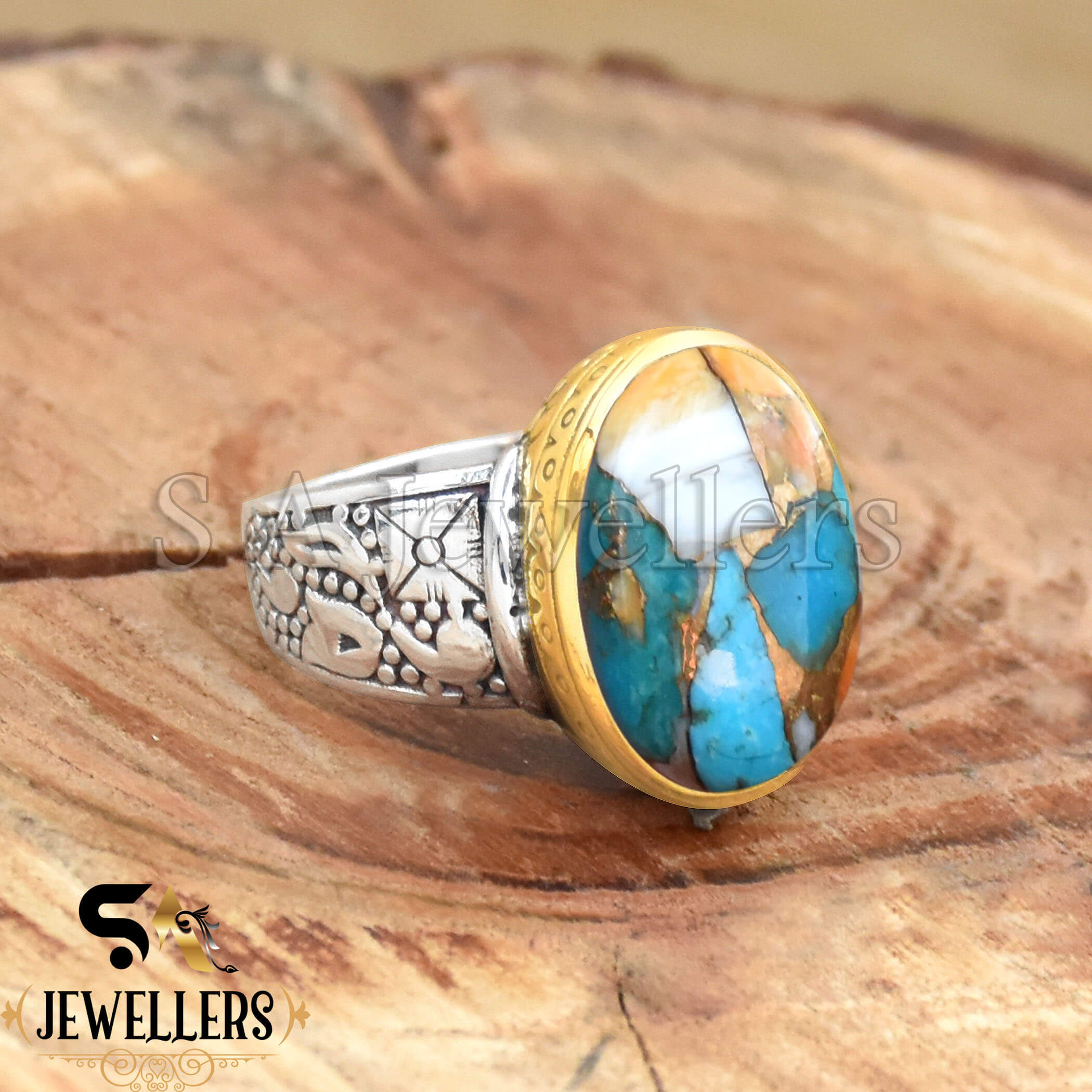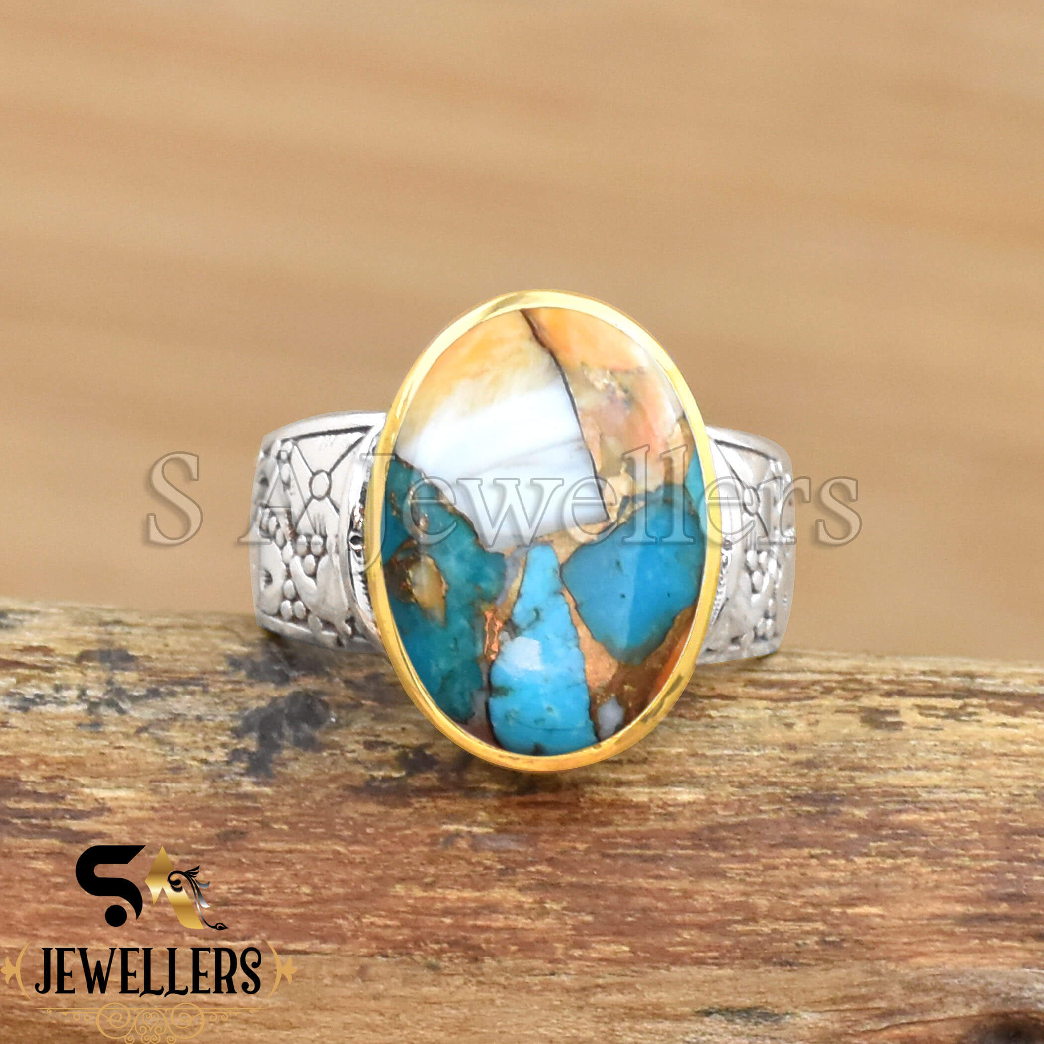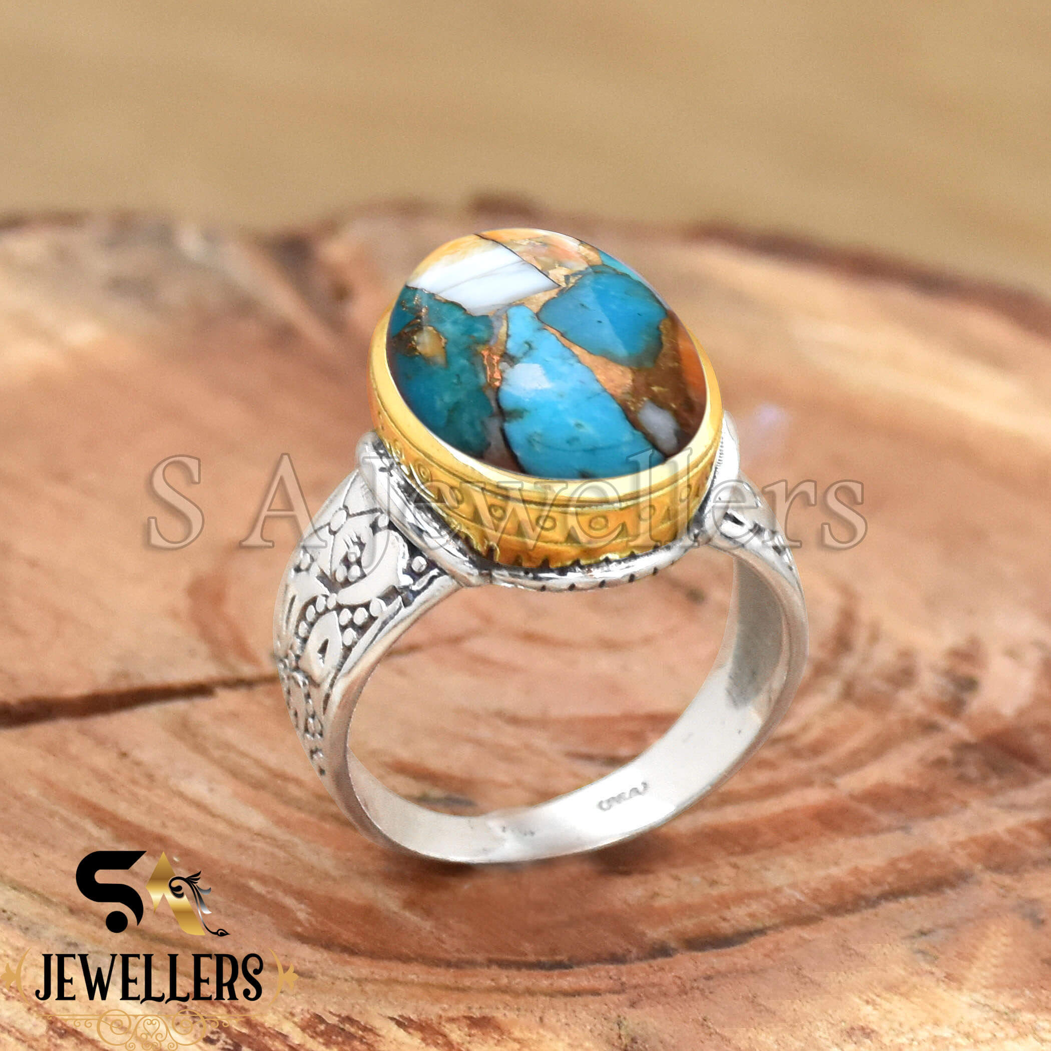 Oyster Copper Turquoise Ring, 925 Sterling Silver Ring, Two Tone Ring