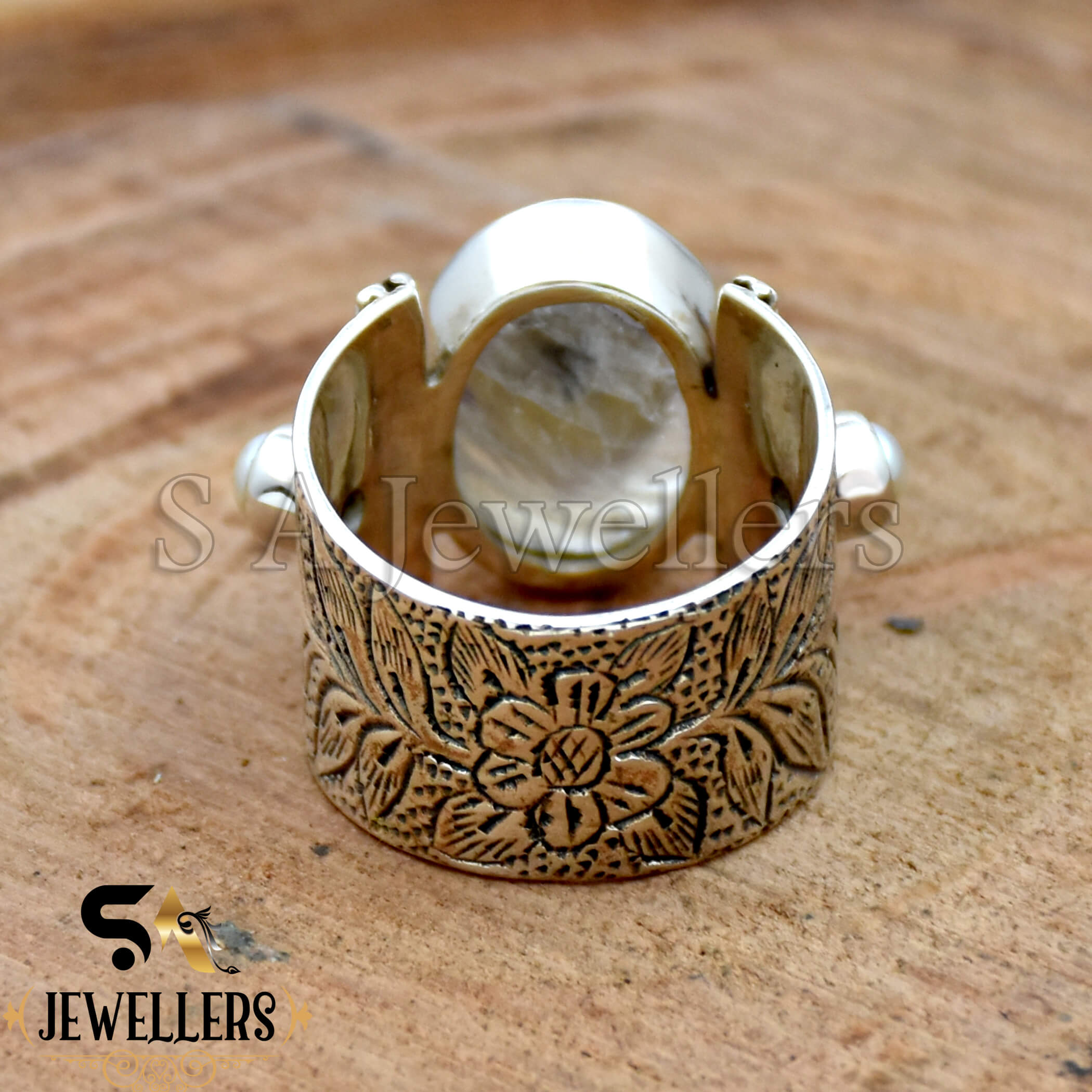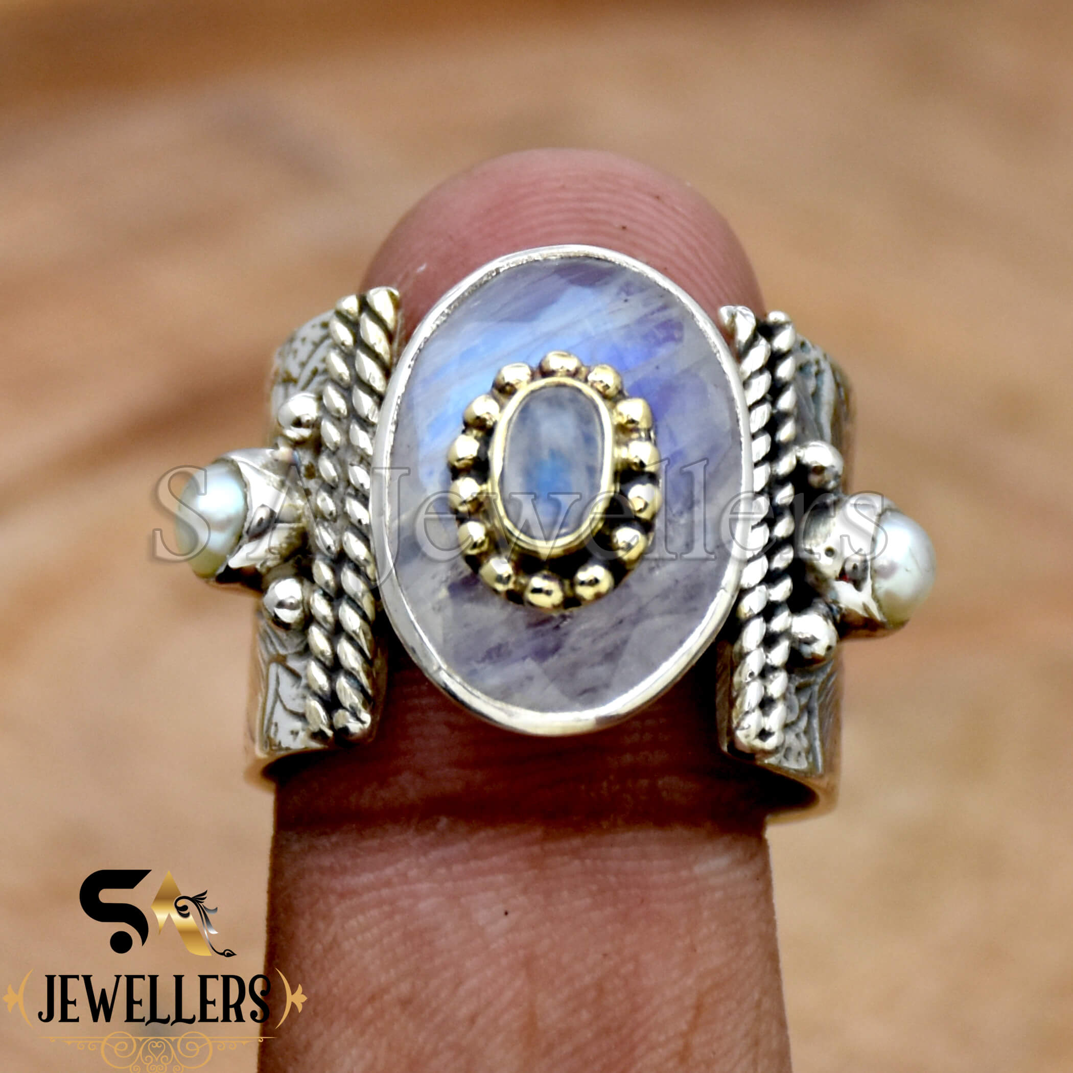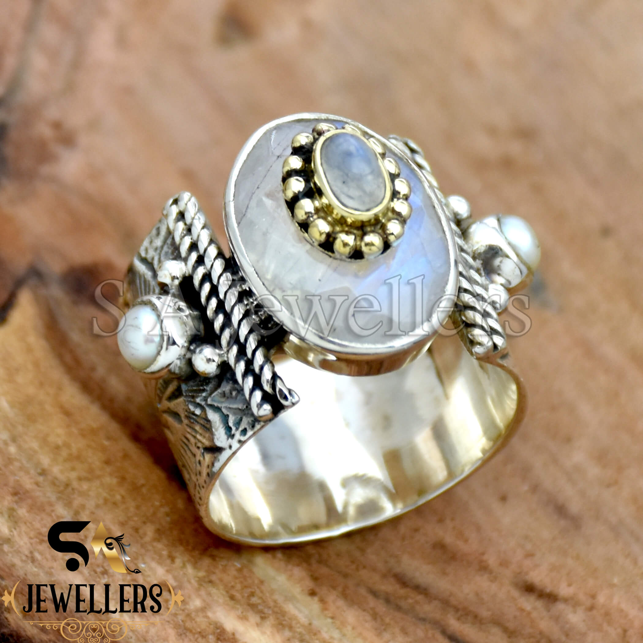 Natural Rainbow Moonstone Ring, 925 Sterling Silver Ring, Moonstone & Pearl Ring Two Tone Ring, Wide Ring, Flower Textured Ring Handmade Jewelry