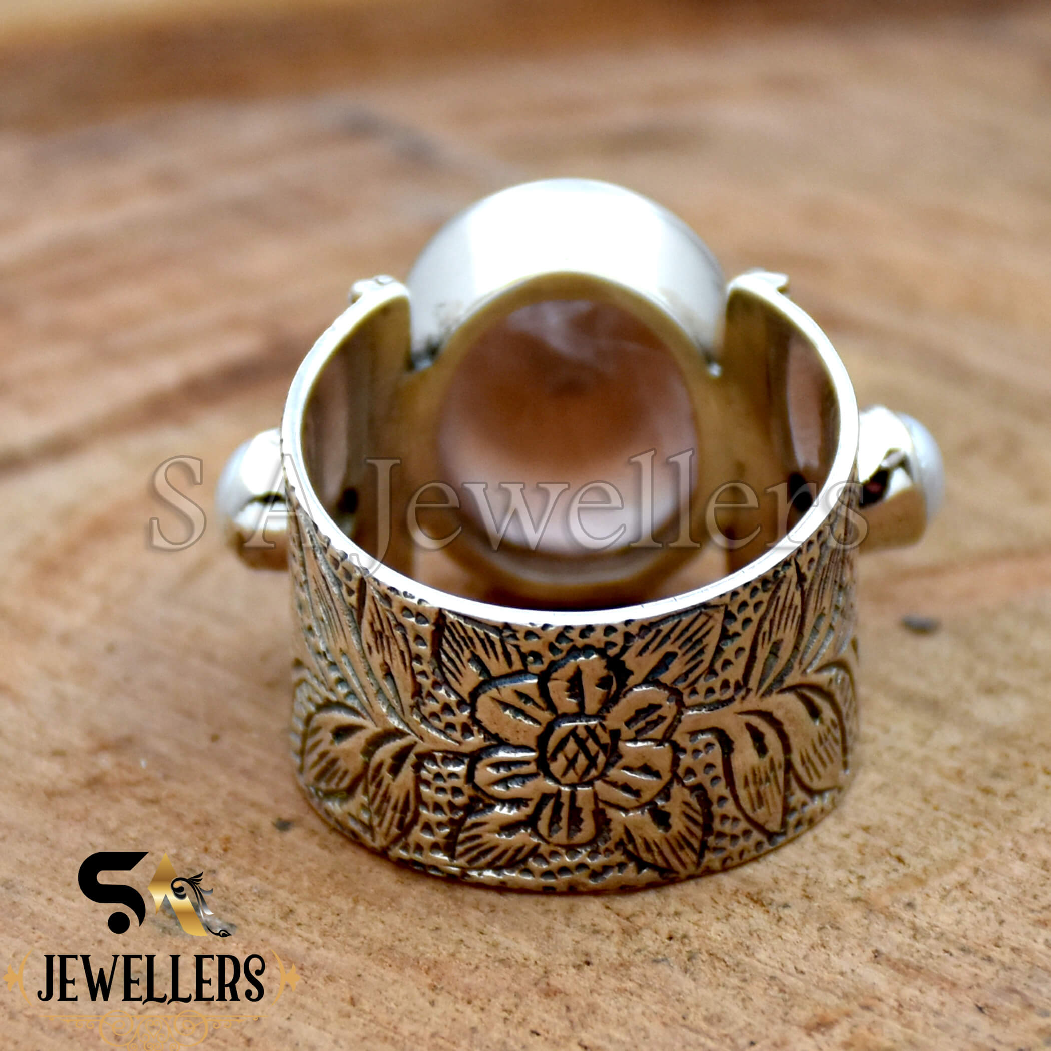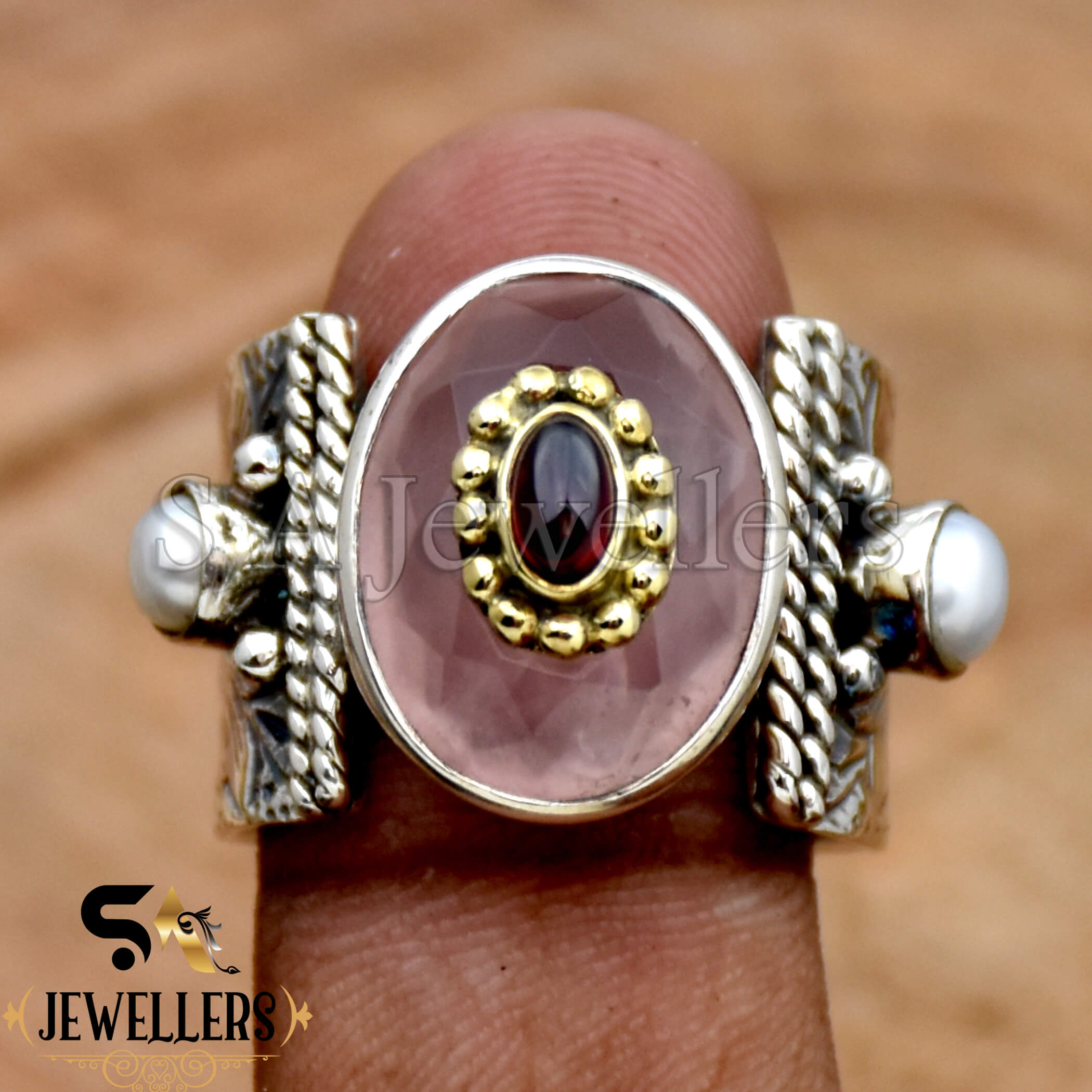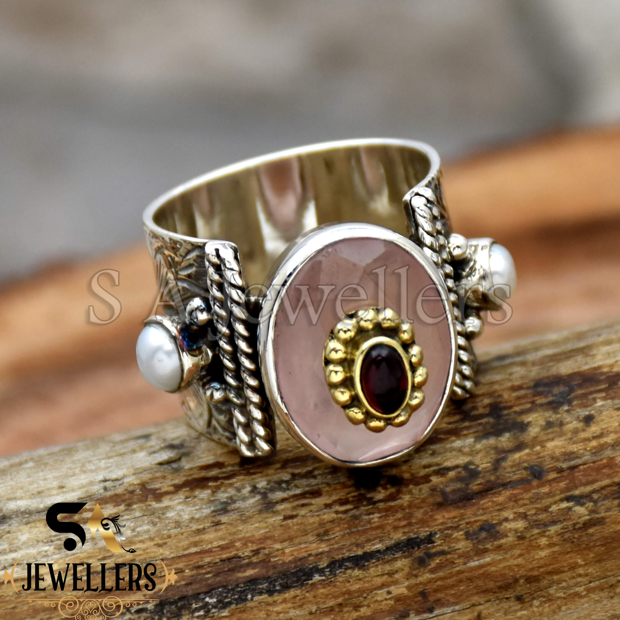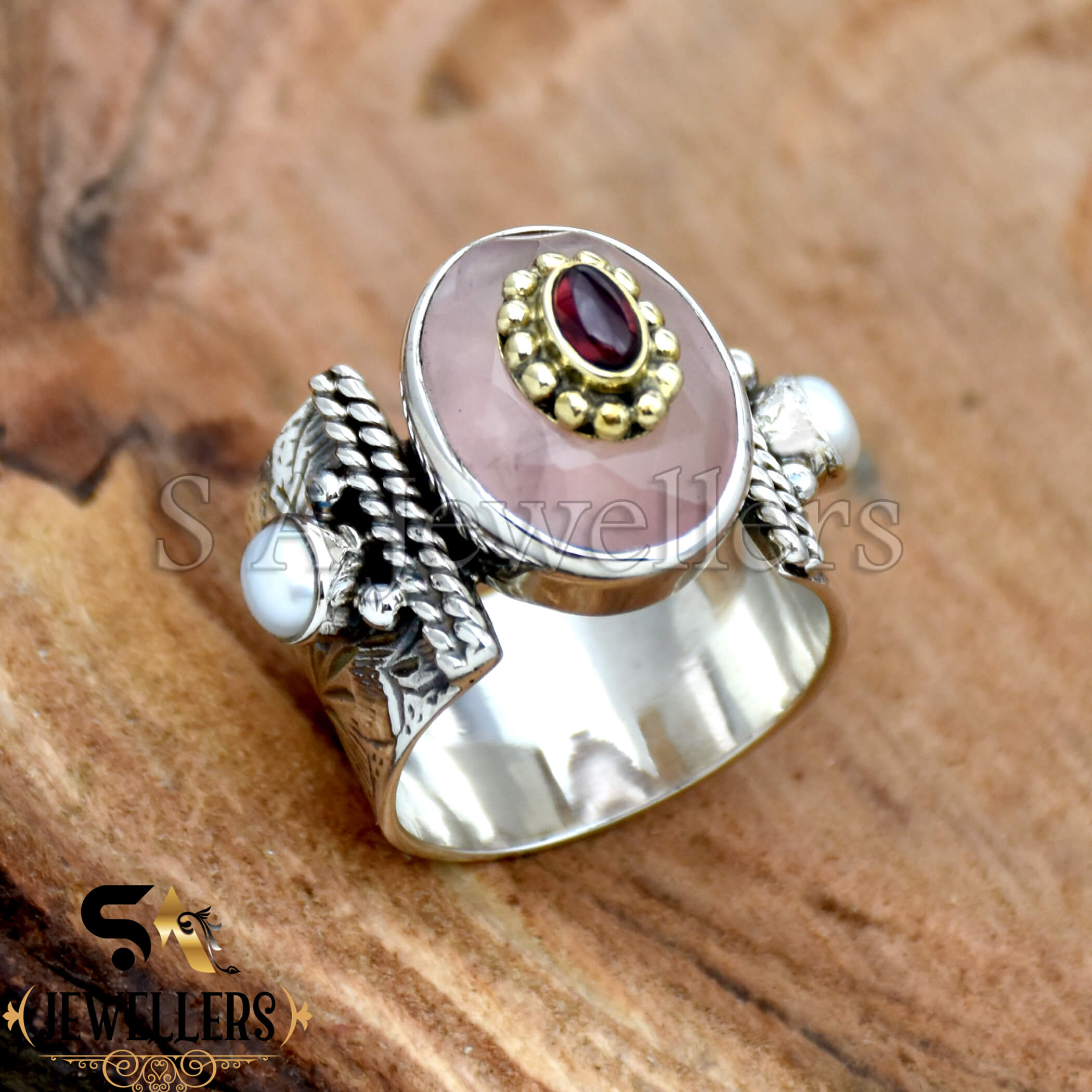 Rose Quartz Ring, 925 Sterling Silver Ring, Garnet & Pearl Ring, Two Tone Ring, Wide Band Ring, Flower Textured Ring, Anniversary Gift