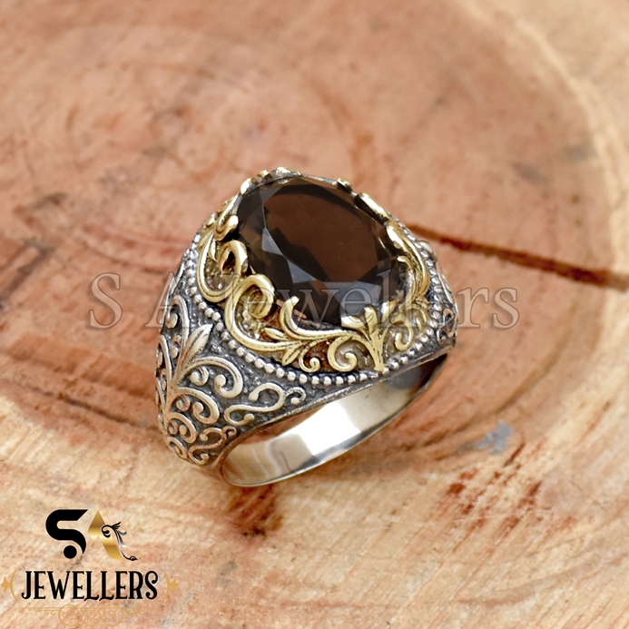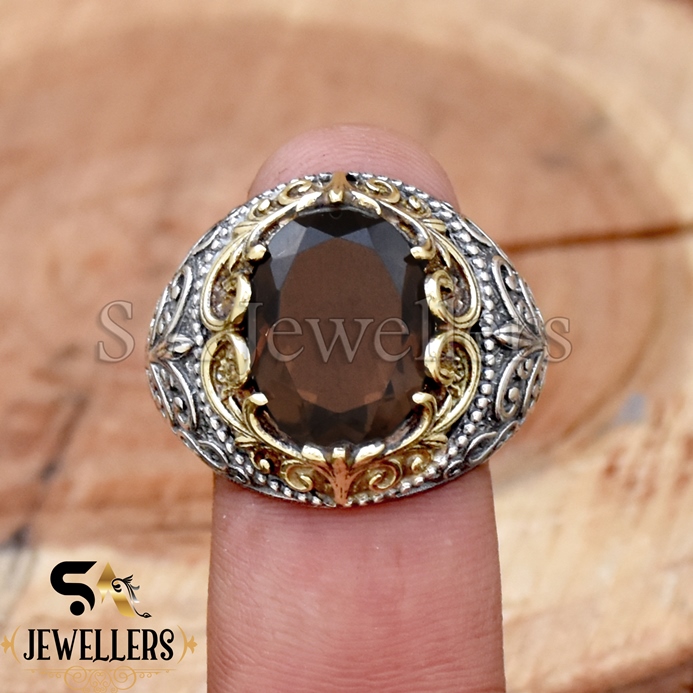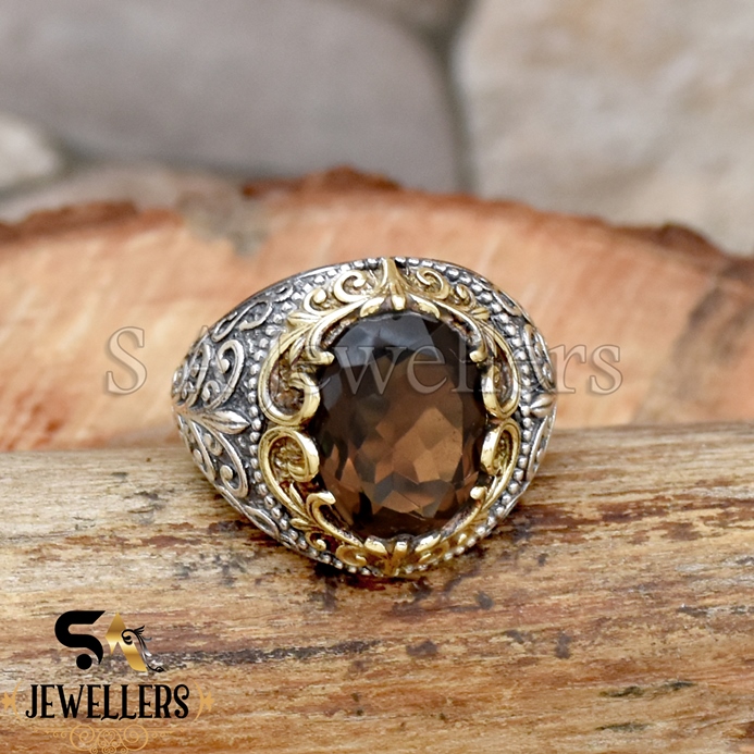 Smoky Quartz Men’s Ring, 925 Sterling Silver Ring, Tow Tone Ring