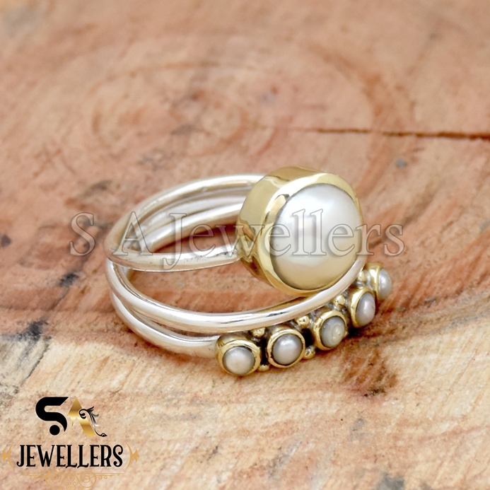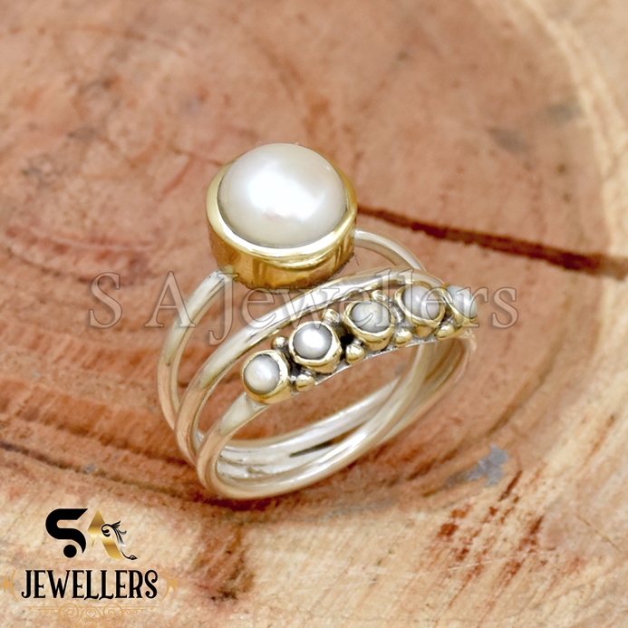 White Pearl Ring, 925 Sterling Silver Ring, Tow Tone Ring, Handmade Ring